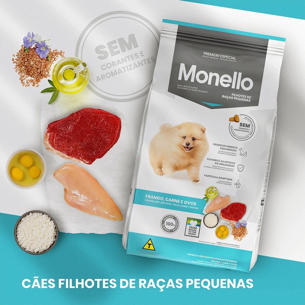 Ração Monello para Cães Filhotes de Porte Pequeno Sabor Frango, Carne e Ovos - Indicada para cães; - Ração Premium especial; - Sem corantes e aromatizantes; - Digestibilidade acima de 80% e baixo teor de sódio; - Garante um desenvolvimento equilibrado e favorece as defesas do organismo; - Garante maior rendimento do produto e redução do odor e volume das fezes; - Auxilia na manutenção da saúde intestinal;