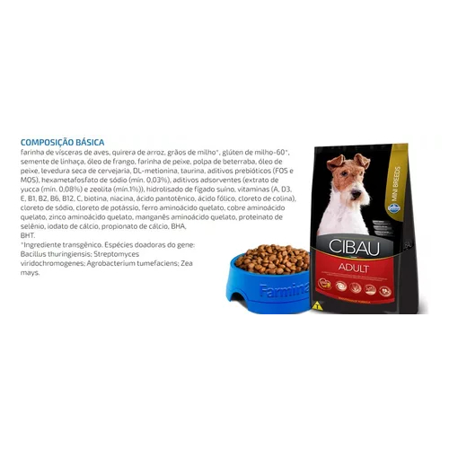 Ração Cibau Cães Adultos Raças Mini - 15kg - Indicado para cães; - Cães de raças pequenas; - Alimento completo e balanceado; - Redução do odor das fezes. Alimento completo e balanceado para cães adultos de raças pequenas. Indoor Formula - Extrato de yucca e zeolita promovem formação de fezes com melhor consistência e odor reduzido. Croquetes Especiais - Partículas adequadas para cães adultos de raças pequenas que proporcionam melhor apreensão e mastigação do alimento. Controle de Tártaro - Hexametafosfato de sódio reduz o acúmulo de tártaro e favorece a saúde bucal. Composição farinha de vísceras de aves, quirera de arroz, milho*, glúten de milho-60*, semente de linhaça, óleo de frango, farinha de peixe, polpa de beterraba, óleo de peixe, levedura seca de cervejaria, DL-metionina, taurina, aditivos prebióticos (FOS e MOS), hexametafosfato de sódio, extrato de yucca, zeolita, hidrolisado de fígado suíno, vitaminas (A, D3, E, B1, B2, B6, B12, C, biotina, niacina, ácido pantotênico, ácido fólico, cloreto de colina), cloreto de sódio, cloreto de potássio, ferro aminoácido quelato, cobre aminoácido quelato, zinco aminoácido quelato, manganês aminoácido quelato, proteinato de selênio, iodato de cálcio, propionato de cálcio, BHA, BHT. *Ingrediente transgênico. Espécies doadoras do gene: Bacillus thuringiensis; Streptomyces viridochromogenes; Agrobacterium tumefaciens; Zea mays.