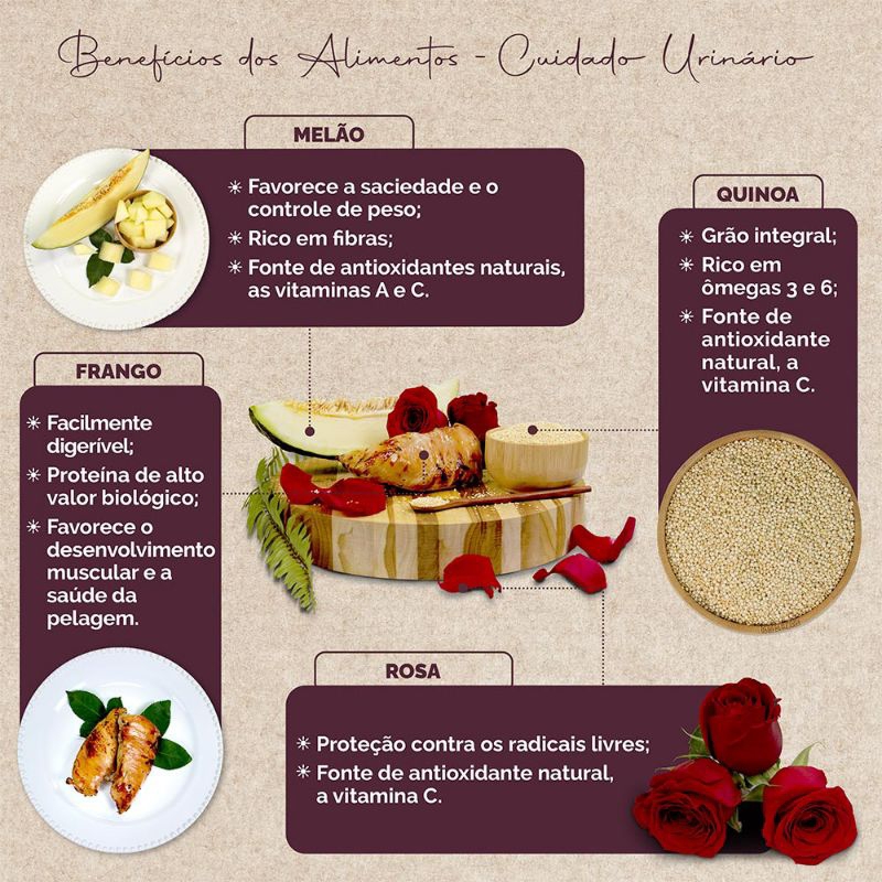 Feita com rosa e melão; - Previne os cálculos urinários - favorece o pH urinário saudável; - Favorece a saciedade e a manutenção do peso; - Combate as bolas de pelo; - Antioxidantes naturais; - Com óleo de peixe rico em ômega 3 - anti-inflamatório natural DHA; - Reduz o odor das fezes – com extrato de yucca; - Fibra especiais - saúde para os intestinos; - Silimarina – saúde para o fígado. A Ração Seca Snow Cat Flores Cuidado Urinário para Gatos Castrados é formulada para auxiliar na manutenção do peso, combater a formação de bolas de pelo e prevenir o surgimento de cálculos urinários, garantindo a saúde do trato urinário do seu felino. Além disso, é rica em ômega 3 e 6, vitaminas e outros nutrientes essenciais para uma nutrição completa. Com uma fórmula livre de corantes, essa ração proporciona um sabor irresistível ao paladar do seu felino. Se você decidir trocar a ração do seu pet, faça isso de forma gradual, misturando pequenas quantidades da nova ração com a antiga ao longo de vários dias. Isso ajuda a evitar problemas digestivos. Sempre forneça água fresca e limpa, especialmente quando ele consome ração seca. Isso ajuda na digestão e na hidratação adequada. Composição Farinha de vísceras de aves, farinha de peixes, milho moído*, quirera de arroz, farelo de resíduos de mandioca, farelo de glúten de milho 60*, farelo de soja**, grão de sorgo, farelo de trigo, polpa de beterraba, melão (0,01%), grão de quinoa (0,01%), rosa (0,01%), óleo de aves, óleo de peixes, hidrolisado de fígado de aves, cloreto de sódio (sal comum), vitamina A (palmitato de retinol), vitamina D3 (colecalciferol), vitamina E (DL-alfa-tocoferol), vitamina K3 (menadiona bissulfito de nicotinamida), vitamina B12 (cianocobalamina), vitamina B6 (piridoxina), vitamina B2 (riboflavina), vitamina B1 (tiamina), ácido pantotênico, niacina, ácido fólico, biotina, cloreto de colina, sulfato de manganês, sulfato de cobre, iodato de cálcio, selenito de sódio, sulfato de zinco, sulfato ferroso, ácido cítrico (0,12%), ácido fosfórico (0,12%), extrato de Yucca (Yucca Schidigera) (0,04%), parede celular de levedura (beta-glucanas, mananoligossacarideo e glucomananos) (0,12%), celulose (1,0%), zeolita (0,3%), bentonita (0,1%), extrato de parede de levedura (betaglucana e mananoligossacarideo) (0,1%), extrato de cardo mariano (0,1%), BHA (Butilhidroxianisol), BHT (Butilhidroxitolueno), Dl-Metionina (0,15%), carnitina (0,01%), taurina (0,15%), cloreto de potássio, sorbato de potássio. Níveis de garantia Umidade (máx.)100,00 g/kg10,0%Proteína Bruta (mín.)350,00 g/kg35,0%Extrato Etéreo (mín.)90,00 g/kg9,0%Fibra Bruta (máx.)45,00 g/kg4,5%Matéria Mineral (máx.)77,00 g/kg7,7%Cálcio (mín.)9000,00 mg/kg0,9%Cálcio (máx.)18,00 g/kg1,8%Fósforo (mín.)8000,00 mg/kg0,8%Ácido linolênico (mín.)3000,00 mg/kg0,3%Ácido Linolêico (mín.)14,00 g/kg1,4%Energia Metabolizável3700,00 kcal/kg-Ácido Cítrico (mín.)1200,00 mg/kg-Ácido fosfórico (mín.)1000,00 mg/kg-Extrato de Yucca346,00 mg/kg-Parede celular de levedura (mín.)590,00 mg/kg-DL-Metionina (mín.)8000,00 mg/kg-Carnitina (mín.)77,00 mg/kg-Taurina (mín.)1400,00 mg/kg-Magnésio (máx.)900,00 mg/kg-DHA (mín.)1000 mg/kg0,1%Sódio (mín.)3000,00 mg/kg- Enriquecimento por Kg Vitamina A11.250,00 U.I./kgVitamina D3937,50 U.I./kgVitamina E37,50 U.I./kgVitamina K30,13 mg/kgVitamina B1225,00 mg/kgVitamina B65,00 mg/kgRiboflavina (Vitamina B2)5,00 mg/kgÁcido Pantotênico6,25 mg/kgNiacina75,00 mg/kgÁcido Fólico1,00 mg/kgTiamina (Vitamina B1)6,25 mg/kgBiotina0,07 mg/kgColina750,00 mg/kgManganês9,38 mg/kgCobre18,75 mg/kgIodo0,44 mg/kgSelênio0,13 mg/kgZinco93,75 mg/kgFerro100,00 mg/kg