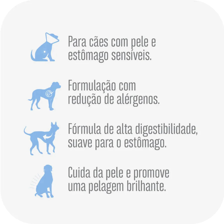 Ração Equilíbrio Sensitive Skin & Stomach para Cães Adultos de Pequeno Porte: A Ração Equilíbrio Sensitive Skin & Stomach para Cães Adultos de Pequeno Porte foi desenvolvida especialmente para cães com pele sensível e digestão delicada. Sua fórmula premium combina ingredientes selecionados, como farinha de salmão, óleo de peixe e biomassa de microalgas, proporcionando nutrição de alta qualidade que favorece a saúde da pele, do pelo e do sistema digestivo. Principais Benefícios: Alta digestibilidade e equilíbrio intestinal: com ingredientes de qualidade, prebióticos e probióticos que favorecem o bom funcionamento do sistema digestivo. Reforço da imunidade natural: enriquecida com vitaminas antioxidantes e minerais orgânicos, que ajudam a manter as defesas do organismo sempre ativas. Pelagem bonita e pele saudável: rica em ácidos graxos essenciais, como ômega 3 e 6, que contribuem para uma pelagem brilhante e pele protegida. Maior energia e vitalidade: com excelente valor energético e alta concentração de proteínas e gorduras de origem animal. Sem corantes artificiais: fórmula mais natural e segura para o seu cão. Equilíbrio nutricional completo: atende todas as exigências diárias dos cães adultos de pequeno porte. Níveis de Garantia: Componente Garantia Umidade (máx.) 110 g/kg (11%) Proteína Bruta (mín.) 230 g/kg (23%) Extrato Etéreo (mín.) 160 g/kg (16%) Matéria Fibrosa (máx.) 30 g/kg (3%) Matéria Mineral (máx.) 80 g/kg (8%) Cálcio (máx.) 13 g/kg (1,3%) Cálcio (mín.) 7500 mg/kg (0,75%) Fósforo (mín.) 7000 mg/kg (0,7%) Sódio (mín.) 2000 mg/kg (0,2%) Potássio (mín.) 6000 mg/kg (0,6%) Mananoligossacarídeos (mín.) 360 mg/kg (0,036%) Ácido linolênico (mín.) 10 g/kg (1%) Ácido linoleico (mín.) 25 g/kg (2,5%) EPA (mín.) 1500 mg/kg (0,15%) DHA (mín.) 1500 mg/kg (0,15%) Enterococcus faecium (mín.) 2,4 x 109 UFC/kg Lactobacillus casei (mín.) 2,4 x 109 UFC/kg Bifidobacterium bifidum (mín.) 1,2 x 109 UFC/kg Lactobacillus acidophilus (mín.) 3 x 109 UFC/kg Lactobacillus lactis (mín.) 1,8 x 109 UFC/kg Bacillus subtilis (mín.) 1,2 x 109 UFC/kg Energia metabolizável 3932 kcal/kg Composição: Quirera de arroz, grão de linhaça, óleo de aves, óleo de peixes, farinha de peixe (15%), farinha de salmão, polpa desidratada de beterraba, levedura de cervejaria inativada desidratada, biomassa de microalgas (Schizochytrium sp.), taurina, cloreto de colina, hexametafosfato de sódio, aditivo prebióticos, aditivo probióticos, extrato de Yucca, cloreto de potássio, cloreto de sódio, ácido propiônico, hidrolisado de carne de aves e fígado de aves, tocoferol (concentrado), extrato de alecrim, ácido fólico, D-pantotenato de cálcio, vitamina A, vitamina B1, vitamina B2, vitamina B6, vitamina B12, vitamina C, vitamina D3, vitamina E, vitamina H, vitamina K3, niacina (ácido nicotínico), complexo cobre aminoácido, complexo ferro aminoácido, complexo manganês aminoácido, proteinato de selênio, complexo zinco aminoácido, iodato de cálcio. Com a Ração Equilíbrio Sensitive Skin & Stomach, seu cãozinho de pequeno porte terá uma alimentação completa, saborosa e feita para garantir mais saúde, energia e qualidade de vida.