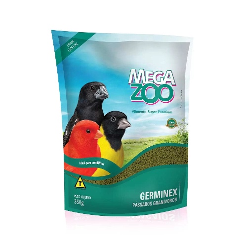 - Alimento extrusada; - Ideal para umidificar; - Auxilia no desmame e cria de filhotes; - Com minerais quelatados, aditivos adsorventes de toxinas, entre outros. Detalhes Ração Megazoo Extrusada para Germinex alimento completo com alto valor biológico indicado para aves granívoras durante o processo de cria e “desmame” de filhotes, tratamento de aves convalescentes ou como substituto de sementes germinadas. Dicas Especiais Modo de usar A megazoo germinex é um produto feito com o objetivo de substituir as sementes germinadas. Assim, recomenda-se seu uso frequente visando o aumento da variedade de alimentos e consequente enriquecimento ambiental, substituindo assim as sementes germinadas de maneira mais segura. Composição Grão de arroz, aveia integral, proteína de soja micronizada*, farelo de soja extrusado*, dextrose, extrato de leveduras (fonte de nucleotídeos), clara de ovo, insetos desidratados, plasma sanguíneo (fonte de imunoglobulinas), farelo de trigo, farinha de alga (Schizochytrium sp), maça desidratada, alfarroba, spirulina, óleo de soja refinado*, óleo de coco, fosfato bicálcico, calcário calcítico, premix vitamínico mineral aminoácido (aditivos adsorventes de toxinas, extrato de cardo-mariano, DL-metionina, vitamina A, vitamina D3, vitamina B1, vitamina B6, vitamina B2, vitamina B12, vitamina C, vitamina E, vitamina K3, niacina, cloreto de colina, ácido fólico, pantotenato de cálcio, biotina, inositol, zinco aminoácido quelato, sulfato de cobre, cobre aminoácido quelato, iodato de cálcio, monóxido de manganês, manganês aminoácido quelato, sulfato de zinco, sulfato de cobalto), cloreto de sódio (sal comum), mananoligossacarídeos-MOS, frutoligossacarídeos-FOS, ferro quelatado, parede celular de leveduras, levedura enriquecida de selênio, L-lisina, triptofano, aditivos conservantes, aromatizante, corante artificial, aditivo antioxidante BHA. *Soja geneticamente modificada por Agrobacterium tumefaciens.