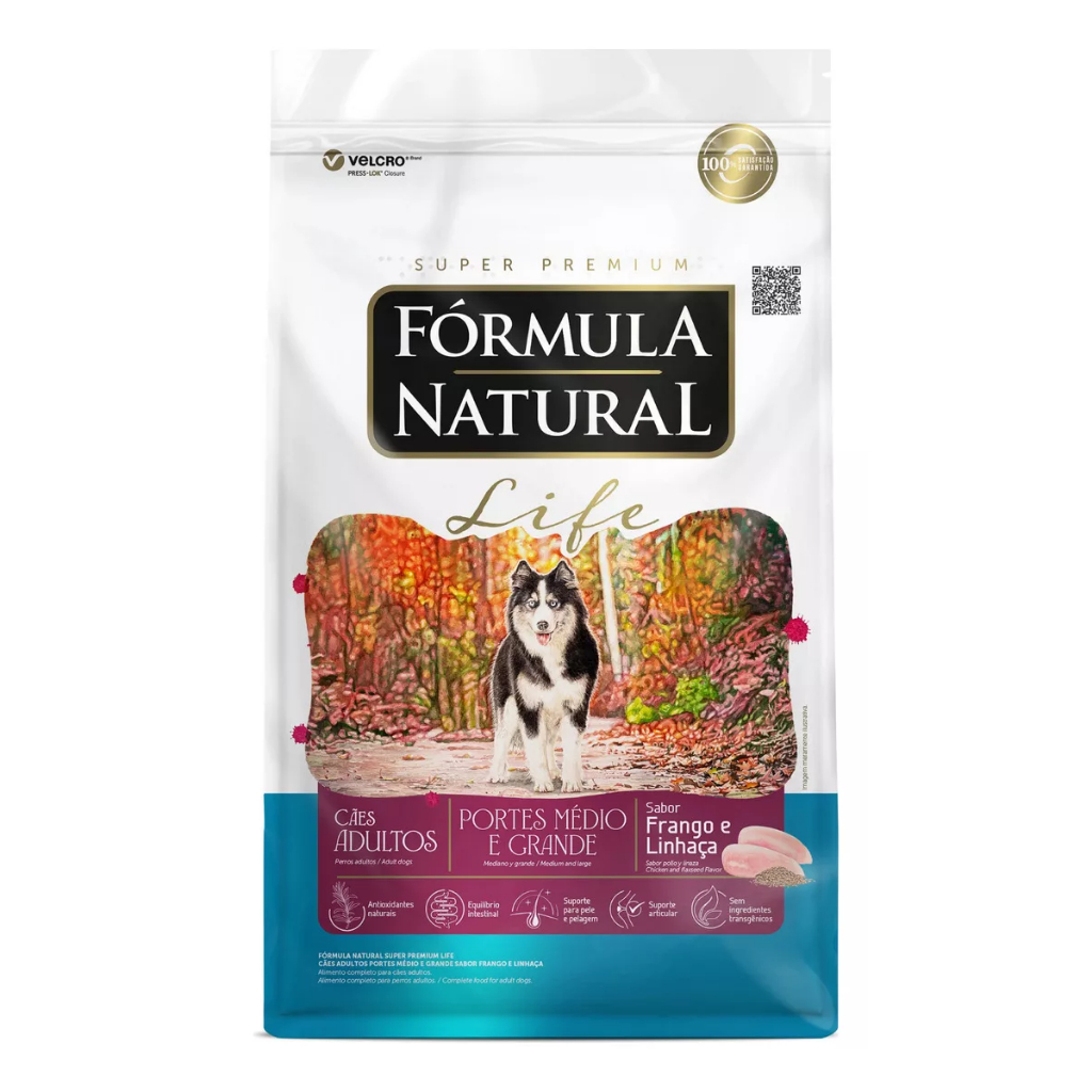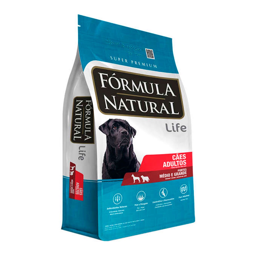 Ração Fórmula Natural Cães Adultos Raças Médias e Grande - 15kg - Indicado para cães adultos; - Equilíbrio da flora intestinal; - Com antioxidantes naturais; - Auxilio às defesas naturais; - Pelo e pelagem brilhantes. A Ração Fórmula Natural foi formulada para promover uma vida mais saudável, longeva e de bem-estar para cães. Mantém a flora intestinal do cão em equilíbrio e o pelo sempre brilhante e sedoso. Possui Ômega 3 e 6. Contém condroitina e glucosamina que contribui para a redução do desenvolvimento de doenças articulares nos cães. E DHA ajuda no desenvolvimento do cérebro. Não contém corante e aromatizantes.