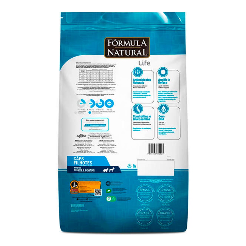 Ração Fórmula Natural Cães Filhotes Raças Médias e Grande - 15kg - Indicado para cães filhotes; - Equilíbrio da fibra intestinal; - Contém DHA; - Auxilio às defesas naturais do pet. A Ração Fórmula Natural foi formulada para promover uma vida mais saudável, longeva e de bem-estar para cães. Oferece todos os cuidados para um ótimo desenvolvimento dos cães filhotes de porte médio e grande, do desmame até 18 meses de idade. Contém condroitina e glucosamina que contribui para a redução do desenvolvimento de doenças articulares nos cães. E DHA ajuda no desenvolvimento do cérebro. Não contém corante e aromatizantes.