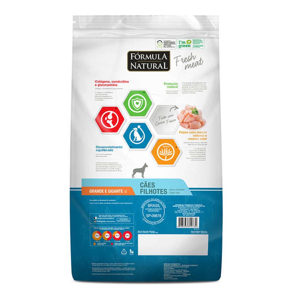 Ração Fórmula Natural Cães Fresh Meat Filhotes Raças Grandes e Gigantes 12kg - Indicado para cães filhotes; - Possui colágeno, condroitina e glucosamina; - Carnes frescas, vitaminas e minerais; - Com anti-inflamatório natural. A Ração Fórmula Natural Fresh Meat é naturalmente saborosa e nutritiva, possui como grande diferencial a utilização de carne fresca e fontes especiais de carboidratos, fibras, vitaminas e minerais, como as frutas e vegetais. Possui cúrcuma que é um anti-inflamatório, antioxidante e imunomodulador natural e DHA que auxilia no desenvolvimento cerebral do filhote. Contém colágeno, condroitina e glucosamina que contribui para a redução do desenvolvimento de doenças articulares nos cães.