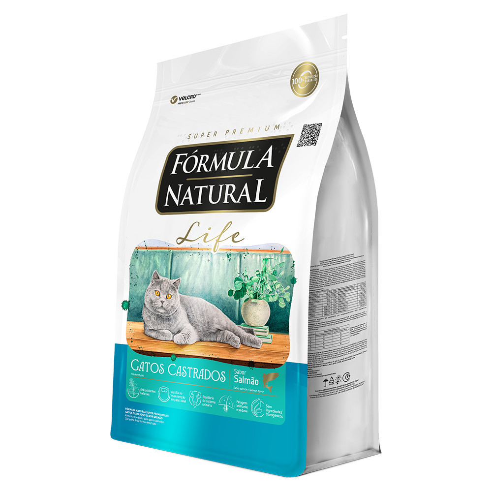 Ração Fórmula Natural Gatos Salmão - 15kg - Indicado para gatos; - Indicado para gatos castrados; - Auxilia o sistema urinário; - Conta com calorias moderadas. A Ração Fórmula Natural oferece um teor menor de calorias e mais fibras para gatos adultos castrados. É um alimento completo e equilibrado que auxilia no sistema urinário do gato. Contém mais fibras e calorias moderadas para melhor controle de peso. Contém antioxidantes naturais, vitaminas A, E e C e extrato de yucca que reduz o odor das fezes. Composição Farinha de vísceras de aves, farinha de peixe, quirera de arroz, farelo de trigo, farinha de torresmo (proteína isolada de suíno), fibra de cana de açúcar, semente de linhaça, óleo de aves, óleo de salmão, hidrolisado de fígado de aves e miúdos de suínos, frutas e vegetais desidratados (manga, maçã, cenoura, tomate), polpa desidratada de beterraba, cloreto de sódio, farinha de alga Schizochytrium sp., parede celular de levedura, frutooligossacarídeos, inulina, extrato de yucca (0,04%), vitaminas (retinol, colecalciferol, acetato de DL-alfa-tocoferol, menadiona bissulfito de sódio, ácido ascórbico, tiamina, riboflavina, piridoxina, cianocobalamina, biotina, pantotenato de cálcio, ácido fólico, niacina, cloreto de colina), minerais (sulfato de ferro, sulfato de cobre, iodato de cálcio, proteinato de zinco, sulfato de zinco, sulfato de manganês, levedura enriquecida com selênio, selenito de sódio, proteinato de manganês), cloreto de potássio, hexametafosfato de sódio, ácido fosfórico, ácido cítrico, metionina, ácido propiônico, taurina, extratos de chá verde, extrato de alecrim, extratos de hortelã, concentrado de tocoferol (antioxidante natural) (0,01%).