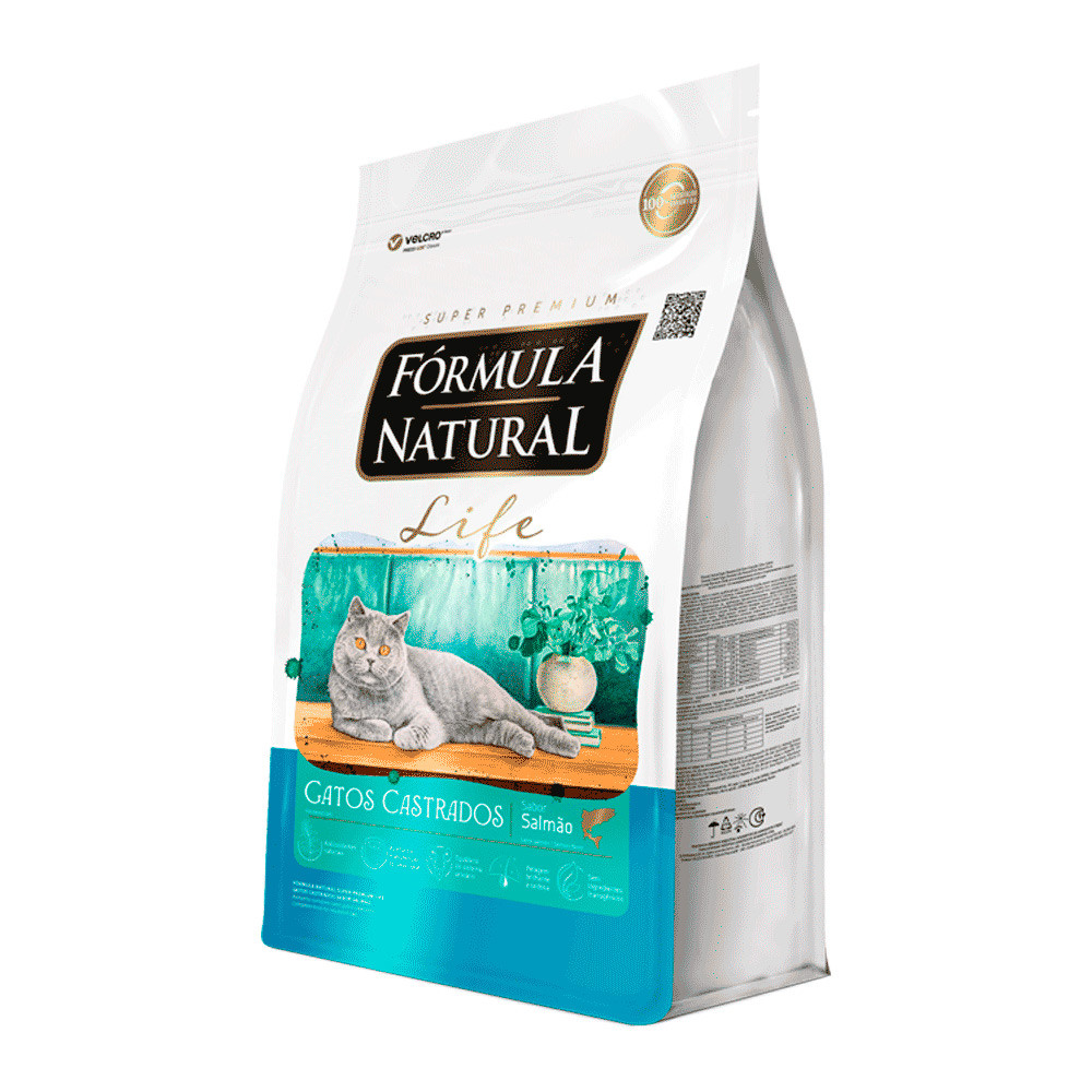 Ração Fórmula Natural Life Para Gatos Castrados Salmão 1kg - Indicada para gatos; - Ideal para gatos castrados;- Auxilia na manutenção do peso ideal; - Equilíbrio do sistema urinário; - Pelagem brilhante e sedosa. A Ração Fórmula Natural Life Gatos Castrados é ideal para atender de forma equilibrada e ajudar a suprir a fome do felino. Fórmula Natural Life Gatos Castrados Salmão é rica em minerais balanceados, auxilia na formação da urina no pH adequado. Como também fontes de ômegas 3 e 6, zinco e proteínas de alto valor biológico, essenciais para favorecer uma pelagem mais sedosa e bonita. A castração é um ato de amor e cuidado, que promove benefícios à saúde e favorece a longevidade. Após a castração os gatos têm em torno de três vezes mais chances de se tornarem obesos, por isso é importante oferecer um alimento específico, formulado para atender a essa nova realidade. Fórmula Natural Life Gatos Castrados oferece uma combinação de calorias moderadas, mais fibras e L-carnitina, que contribui para a manutenção do peso ideal dos gatos castrados. Ingredientes Farinha de vísceras de aves, farinha de peixes, quirera de arroz, farelo de trigo, farinha de torresmo, fibra de cana-de-açúcar, levedura de cervejaria inativada desidratada, grão de linhaça, óleo de aves, óleo de salmão, hidrolisado de fígado de aves e suíno, frutas e vegetais desidratados ( manga, maçã, cenoura), polpa de beterraba, cloreto de sódio, cloreto de potássio, biomassa de microalgas (Schizochytrium sp.), parede celular de levedura, frutooligossacarídeos, inulina, extrato de yucca (0,04%), L-carnitina, taurina, metionina, hexametafosfato de sódio, vitaminas (A, D3, E, K3, B1, B2, B5, B6, B12, C, niacina, ácido fólico, biotina, cloreto de colina), minerais (sulfato de ferro, sulfato de cobre, sulfato de manganês, sulfato de zinco, iodato de cálcio, selenito de sódio, organozinco, organosselênio, organomanganês), bentonita, ácido propiônico, ácido fosfórico, ácido cítrico, cloreto de amônio, sulfato de amônio, extratos de alecrim, chá verde e hortelã, concentrado de tocoferóis(0,01%).