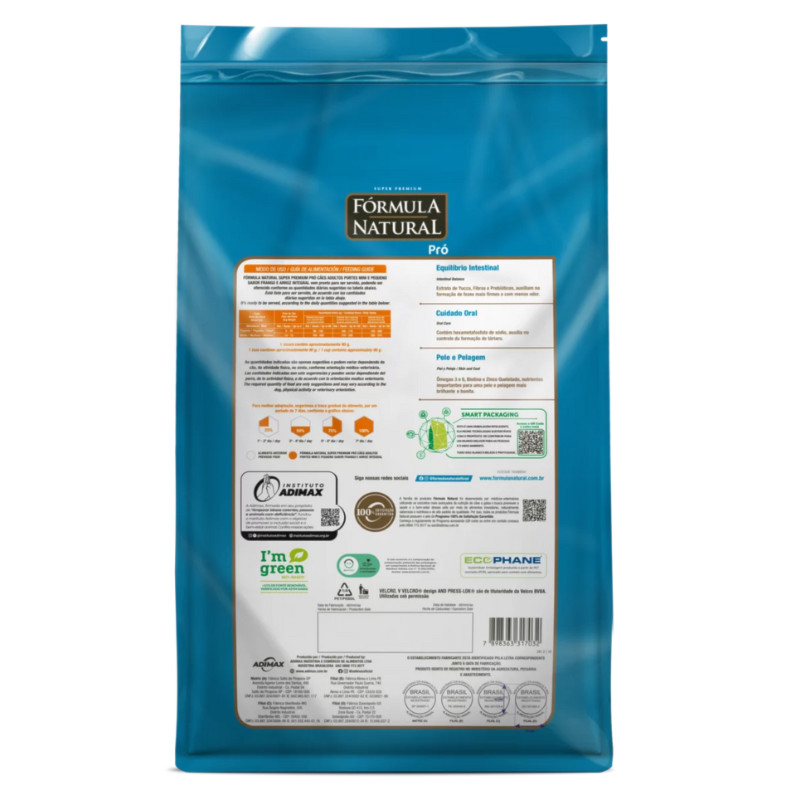 Ração Formula Natural Pró Cães Adultos Porte Mini e Pequeno 2,5 kg Sabor Frango e Arroz Integral Pet: Cães Porte: Mini e Pequeno Apresentação: Disponível com 1, 2,5 e 15 kg. Quais os benefícios da Ração Formula Natural Pró Cães Adultos Porte Mini e Pequeno? Formulada por médicos veterinários, a linha Formula Natural Pró conta com uma grande variedades de Ingredientes Naturais, oferecendo um grande valor nutricional para seu Pet, auxilia na saúde da pele, articulações e oral. Disponível no Sabor Frango e Arroz Integral, duas grandes fontes de proteína e carboidrato, garantindo longevidade, bem-estar e qualidade de vida ao seu Pet. Formula Natural Pró é livre de transgênicos, corantes e aromatizantes artificiais. Ou seja, não há nenhum ingrediente geneticamente modificado em sua composição. Ingrediente Naturais: Mais Saúde para seu Pet! Livre de ingredientes artificiais, a Linha Formula Natural Pró é rica de alimentos naturais, tais como, extrato de yucca, prébioticos e fibras, que melhoram o funcionamento do intestino. Contem uma grande variedade de vitaminas e minerais (A, D3, E, K3, B1, B2, B5, B6, B12, C) que auxiliam no cuidado oral e melhoram a qualidade da pele e pelagem. Composição Básica: Farinha de vísceras de aves, milho moído*, farelo de trigo, óleo de aves, farelo de glúten de milho-60*, arroz integral, hidrolisado de fígado de aves e suíno, polpa de beterraba, grão de linhaça, óleo de salmão, cloreto de sódio, parede celular de levedura, inulina, extrato de yucca (0,04%), sulfato glicosamina (0,03%), sulfato de condroitina (0,01%), colágeno hidrolisado (0,01%), hexametafosfato de sódio (0,1%), vitaminas (A, D3, E, K3, B1, B2, B5, B6, B12, C, niacina, ácido fólico, biotina, cloreto de colina), minerais (sulfato de ferro, sulfato de manganês, sulfato de zinco, iodato de cálcio, selenito de sódio, sulfato de cobre, proteinato de zinco, proteinato de manganês, levedura enriquecida com selênio) cloreto de potássio, ácido propiônico, BHA (Butilhidroxianisol) e BHT (Butilhidroxitolueno). Contém, na composição, alimento geneticamente modificado: milho*. Espécies doadoras de gene: Agrobacterium spp.*, Bacillus thuringiensis*, Streptomyces spp.*. Enriquecimento: Vitamina A 16.000UI; Vitamina D3 900UI; Vitamina E 100UI; Vitamina K3 0,10mg; Vitamina B1 2,60mg; Vitamina B2 6,0mg; Vitamina B6 1,60mg; Vitamina B12 40,00mcg; Biotina 0,06mg; Vitamina C 60,00 mg; Ácido Fólico 0,30mg; Ácido Pantotênico 14,00mg; Niacina 15,00mg; Colina 600mg; Ferro 40,00mg; Cobre 5,60mg; Iodo 0,85mg; Manganês 3,0mg; Zinco 74,00mg; Zinco Quelatado 50,0mg; Selênio 0,30mg; Selênio Complexado 0,1mg; Proteinato de manganês 20,0mg.