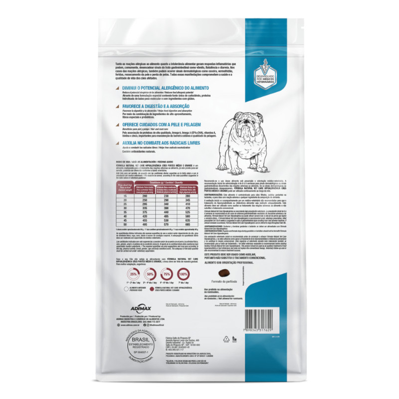 Ração Fórmula Natural Vet Care Hipoalergênica para Cães de Porte Médio e Grande 10,1 kg Pet: Cães Porte: Médio e Grande Condição: Alimento seco coadjuvante para cachorros adultos com hipersensibilidade alimentar Quais os benefícios da Ração Fórmula Natural Vet Care Hipoalergênica para Cães de Porte Médio e Grande? A Ração Fórmula Natural Vet Care Hipoalergênica é uma excelente opção para cães de porte médio e grande que sofrem com hipersensibilidade alimentar. Essa ração é formulada com ingredientes cuidadosamente selecionados para minimizar o risco de reações alérgicas e intolerâncias alimentares. Uma das principais características da Fórmula Natural Vet Care Hipoalergênica é a presença de prebióticos em sua composição. Essas substâncias auxiliam no equilíbrio da flora intestinal, o que contribui para uma melhor digestão e absorção dos nutrientes pelo organismo do cão. Outro ingrediente importante da ração é a fonte de proteína hidrolisada. Essa proteína é quebrada em pequenas partículas, o que facilita sua digestão e assimilação pelo corpo do animal. Isso é especialmente importante para cães com hipersensibilidade alimentar, que podem apresentar dificuldades em digerir proteínas mais complexas. Além disso, a Fórmula Natural Vet Care Hipoalergênica contém EPA e DHA, que são ácidos graxos essenciais para a saúde do sistema cardiovascular, além de possuírem propriedades anti-inflamatórias e imunomoduladoras. A ração também é enriquecida com antioxidantes naturais, como vitamina E e selênio, que ajudam a proteger as células do organismo contra o estresse oxidativo causado pelos radicais livres. A Ração Fórmula Natural Vet Care Hipoalergênica é uma excelente opção para cães de porte médio e grande que sofrem com hipersensibilidade alimentar. Sua fórmula cuidadosamente elaborada oferece prebióticos, fonte de proteína hidrolisada, EPA e DHA e antioxidantes naturais, que colaboram para o diagnóstico e tratamento desses problemas de saúde. Qual a importância de oferecer um alimento específico para cachorros com hipersensibilidade alimentar? Oferecer um alimento específico para cachorros com hipersensibilidade alimentar é extremamente importante porque esses animais apresentam uma reação adversa a determinados ingredientes presentes na alimentação. Essas reações podem ser causadas por diversos motivos, como intolerância a certos alimentos, alergias alimentares ou sensibilidade a ingredientes específicos. Quando um cão com hipersensibilidade alimentar consome alimentos que contêm ingredientes aos quais ele é sensível, ele pode apresentar diversos sintomas, como coceira, dermatite, vômitos, diarreia, flatulência, entre outros. Esses sintomas podem causar desconforto ao animal e afetar sua qualidade de vida. Ao oferecer um alimento específico para cães com hipersensibilidade alimentar, é possível garantir que o pet receba uma dieta equilibrada e nutricionalmente completa, sem correr o risco de ingerir ingredientes que possam desencadear reações alérgicas ou intolerâncias alimentares. Esses alimentos são geralmente formulados com ingredientes selecionados que minimizam o risco de reações adversas e podem incluir proteínas hidrolisadas, carboidratos de fácil digestão e outros nutrientes que ajudam a manter a saúde intestinal do pet. Dessa forma, oferecer um alimento específico para cachorros com hipersensibilidade alimentar é fundamental para garantir que o pet receba a alimentação adequada e se mantenha saudável e feliz. Além disso, essa dieta também pode ajudar no tratamento e prevenção de problemas de saúde relacionados à hipersensibilidade alimentar, melhorando a qualidade de vida do pet. Composição Básica: Proteína hidrolisada de frango (mín. 20%), fécula de mandioca, farinha de mandioca, levedura de canade-açúcar inativada e desidratada, polpa de beterraba, fibra de cana-de-açúcar, óleo de aves, óleo de salmão, óleo de girassol, óleo de linhaça, cloreto de sódio, biomassa de microalgas (Schizochytrium sp.), zeólita, parede celular de levedura, frutooligossacarídeos, inulina, vitaminas, minerais, fosfato bicálcico, carbonato de cálcio, lisina, metionina, extratos de chá verde, extrato de alecrim, concentrado de tocoferóis (antioxidante natural) (0,01%).