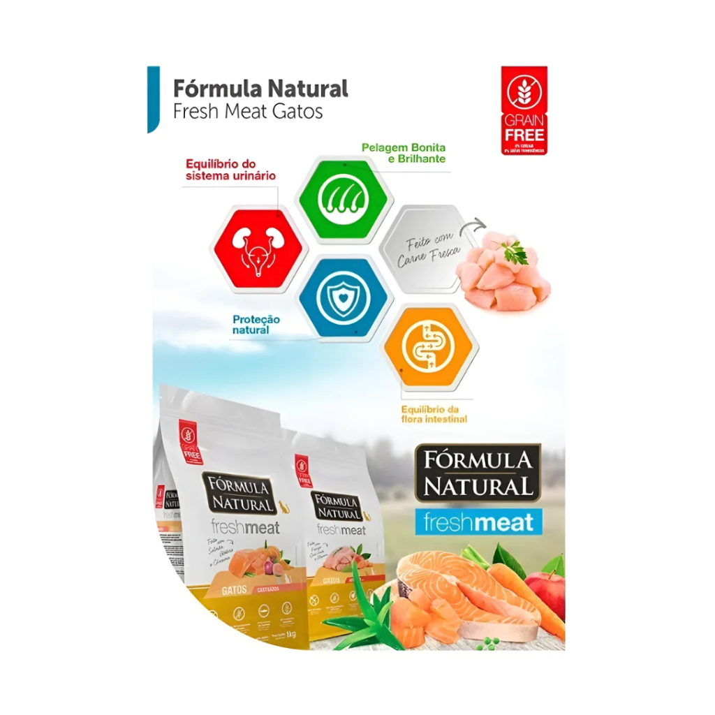 Ração Fórmula Natural Fresh Meat Gato Castrado Carne 1Kg Antioxidantes naturais; Flora intestinal equilibrada; Equilíbrio do sistema urinário; Sem corantes e sem aromatizantes artificiais.