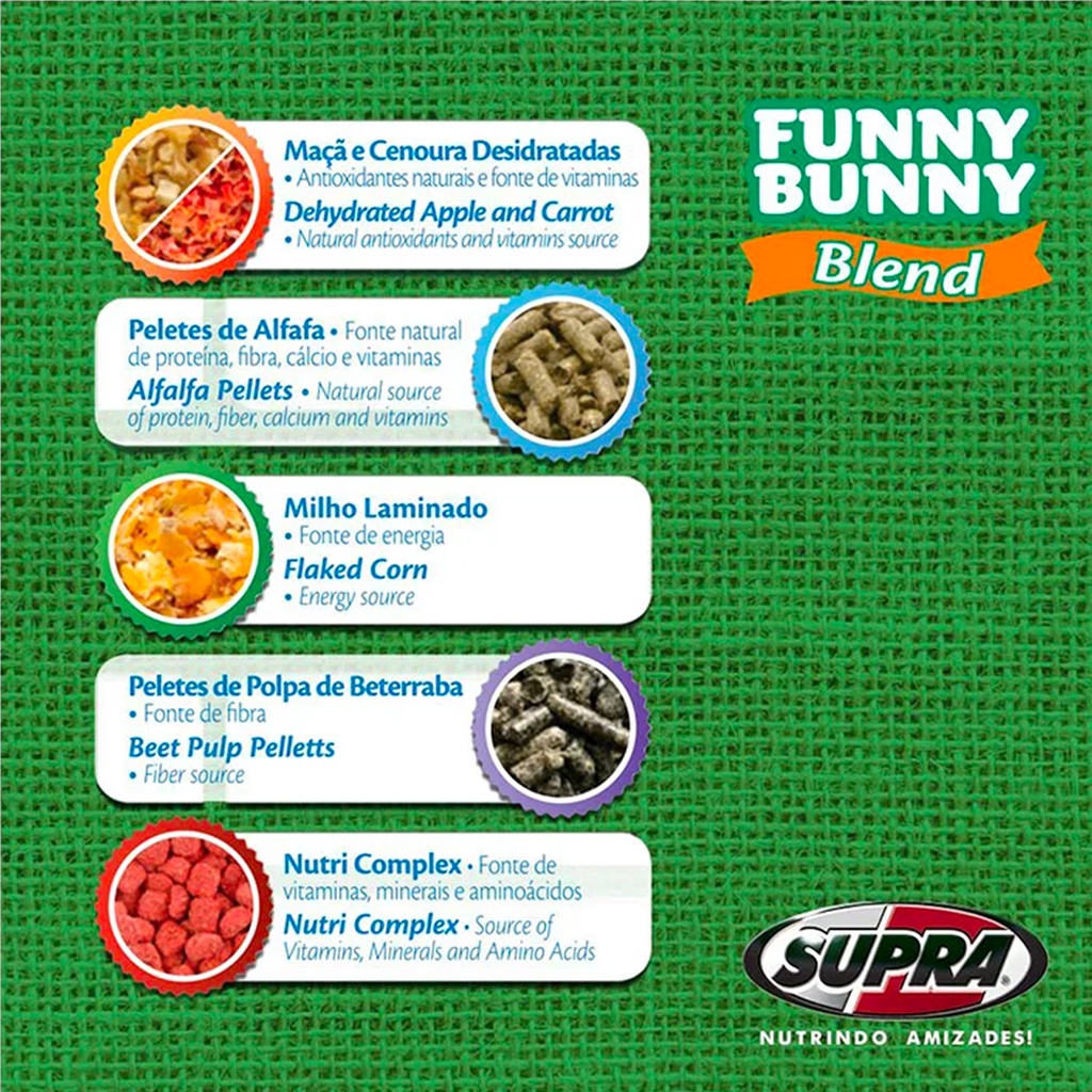🥕 Ração Funny Bunny Blend Supra - Coelhos e Pequenos Roedores | 500g | Nutrição Premium com Fecho Zip 🐹 Dê ao seu amiguinho o que há de melhor! A Ração Supra Funny Bunny Blend é um alimento completo e balanceado, desenvolvido com carinho para garantir a vitalidade e a saúde de Coelhos e Pequenos Roedores (como Hamsters, Porquinhos-da-Índia, Camundongos, etc.). Com uma composição rica e variada, ela oferece uma dieta divertida e nutritiva, imitando a alimentação natural. ✨ Por Que Escolher Funny Bunny Blend? Mistura Especial (Blend): Contém ingredientes variados e saborosos que enriquecem a dieta: 🥕 Extrusado de cenoura 🌽 Milho laminado 🌻 Semente de girassol 🌿 Pellets de alfafa - Nutricomplex: Fonte de minerais e aminoácidos essenciais. - Fecho Zip Inovador: Abre para servir e fecha hermeticamente para manter o alimento sempre fresco, crocante e protegido contra a umidade e pragas. - Rico em Fibras: Com alfafa peletizada e polpa de beterraba, auxilia na saúde intestinal e no desgaste natural dos dentes. - Fontes de Energia e Nutrientes: Milho laminado como energia, e maçã e cenoura desidratadas, ricas em Antioxidantes e Vitaminas (A, C, D3, E, K3, B-Complexo). - Extrato de Yucca: Ajuda a reduzir o odor das fezes, mantendo o ambiente do seu pet mais agradável. 💖 Detalhes do Produto Indicação: Coelhos, Hamsters, Porquinhos-da-Índia e Roedores de pequeno porte. Idade: Filhotes, Adultos e Idosos. Peso: 500 g Embalagem: Pacote com Fecho Zip para máxima conservação. 🔬 Composição Nutricional Uma fórmula completa que garante uma vida longa e saudável: Arroz Integral, Milho Moído*, Farinha de Trigo, Farelo de Soja**, Espinafre Desidratado, Cenoura, Maçã (Cubos), Grão de Linhaça, Feno Moído de Alfafa, Polpa Desidratada de Beterraba, Cloreto de Sódio, Vitaminas, Minerais e mais. IMPORTANTE: Lembre-se de lavar os utensílios e fazer a limpeza completa da gaiola/habitat do seu pet regularmente para garantir sua saúde e bem-estar. ❓ Perguntas Frequentes (FAQ) Quais pets podem consumir? - É ideal para Coelhos, Hamsters, Porquinhos-da-Índia, Camundongos e outros roedores pequenos. Sempre consulte o médico-veterinário do seu pet para uma dieta personalizada. Qual a quantidade ideal por dia? - A porção diária deve ser determinada pelo médico-veterinário, pois ele considera a idade, peso, raça e hábitos do seu animal. Essa ração é um alimento completo? - Sim, a Funny Bunny Blend é um alimento completo e balanceado para a nutrição diária dos seus roedores. Clique em Comprar e garanta uma alimentação nutritiva e saborosa para seu pet!