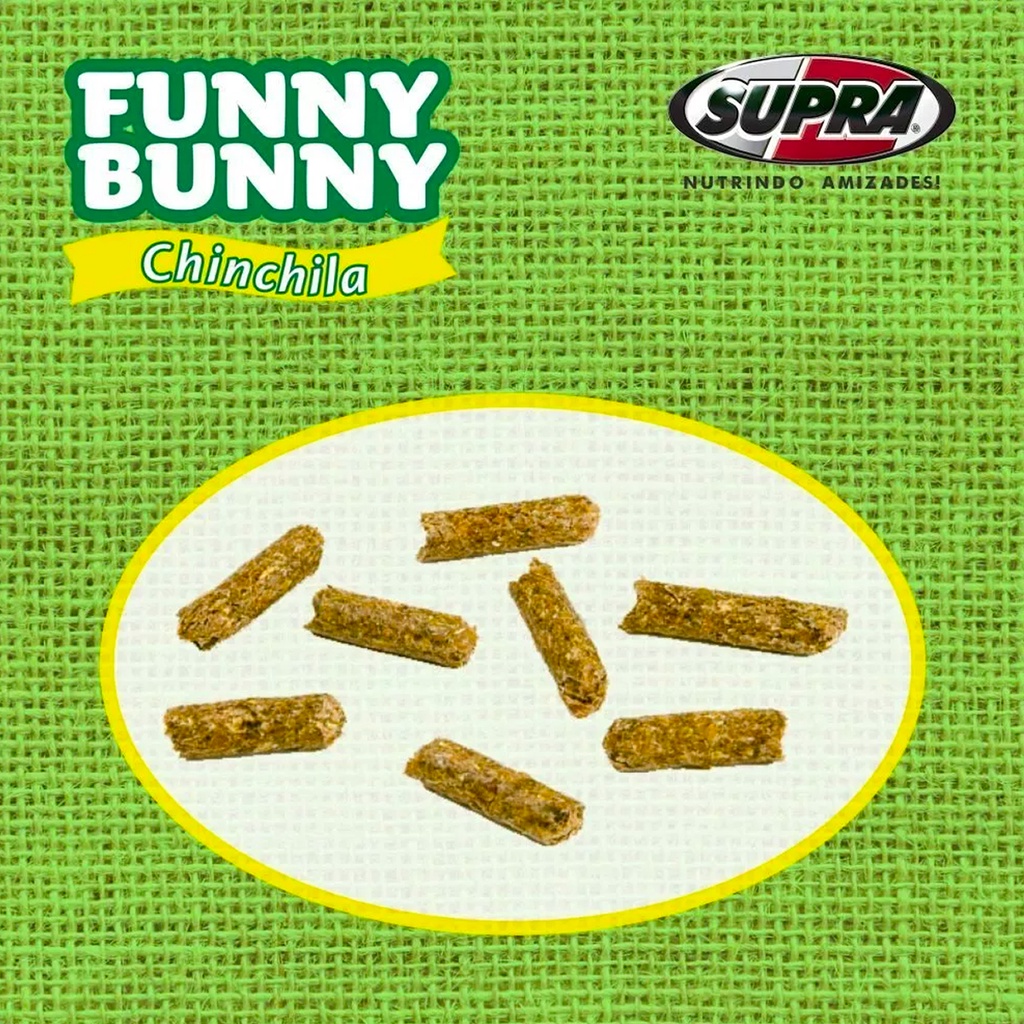 🐰 Ração Funny Bunny Chinchila 700g - Nutrição Premium com Alfafa e Fecho Zip! ✨ Principais Benefícios e Características - 700g de Nutrição Completa: Embalagem ideal com a quantidade certa para garantir a alimentação balanceada do seu pet. - Fórmula Extrusada Super Saborosa: Garante alta digestibilidade e aceitação, pois cada partícula contém todos os nutrientes essenciais. - Rica em Alfafa (32%): Fonte de fibras longas essenciais para o bom funcionamento intestinal e para o desgaste natural dos dentes de chinchilas, porquinhos-da-índia e outros roedores. - Complexo de Vitaminas e Minerais: Enriquecida com Vitaminas A, C, D3, E e K3, além de importantes minerais, promovendo uma saúde completa e um sistema imunológico forte. - Embalagem com Fecho Zip: Praticidade total! Abre para servir e sela hermeticamente, conservando o frescor, o sabor e as propriedades nutritivas por muito mais tempo. - Com Extrato de Yucca (0,03%): Ajuda a reduzir o odor das fezes e da urina no ambiente do seu pet. 💖 Detalhes que Fazem a Diferença A Ração Supra Funny Bunny Chinchila foi elaborada com ingredientes rigorosamente selecionados para ser a dieta base de roedores de estimação, como Chinchilas, Porquinhos-da-Índia e Hamsters (raças pequenas). Sua composição balanceada não só agrada o paladar, mas também oferece os nutrientes necessários para todas as fases da vida do seu bichinho: Filhotes, Adultos e Idosos. 💡 Dica de Alimentação (Super Importante para Roedores!) - Mantenha sempre a ração fresca e água limpa à disposição do seu pet. - Lembre-se: Chinchilas e outros roedores são animais de hábito noturno e tendem a se alimentar majoritariamente durante a noite. Garanta que o comedouro esteja sempre abastecido! 🧪 Níveis de Garantia e Composição (Informação Técnica) Indicação: Chinchila, Porquinho da Índia, Hamster (Raças Pequenas) Apresentação: Pacote de 700g