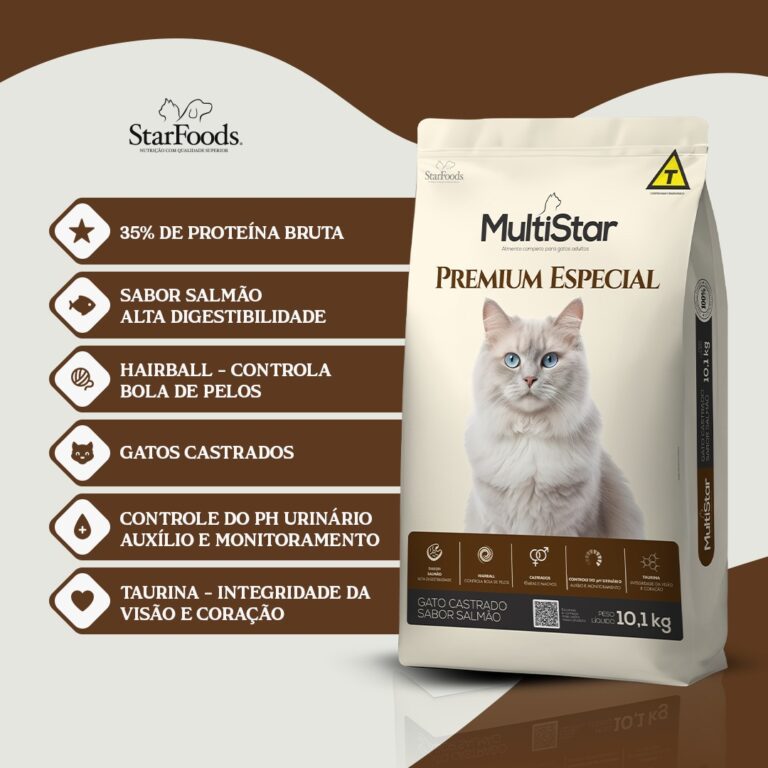 | Ração Gatos Multi Star Cat Castrado Salmão - 10,1kg este produto | R$ 139,90 | 17% | 4.9/5 | 5 |