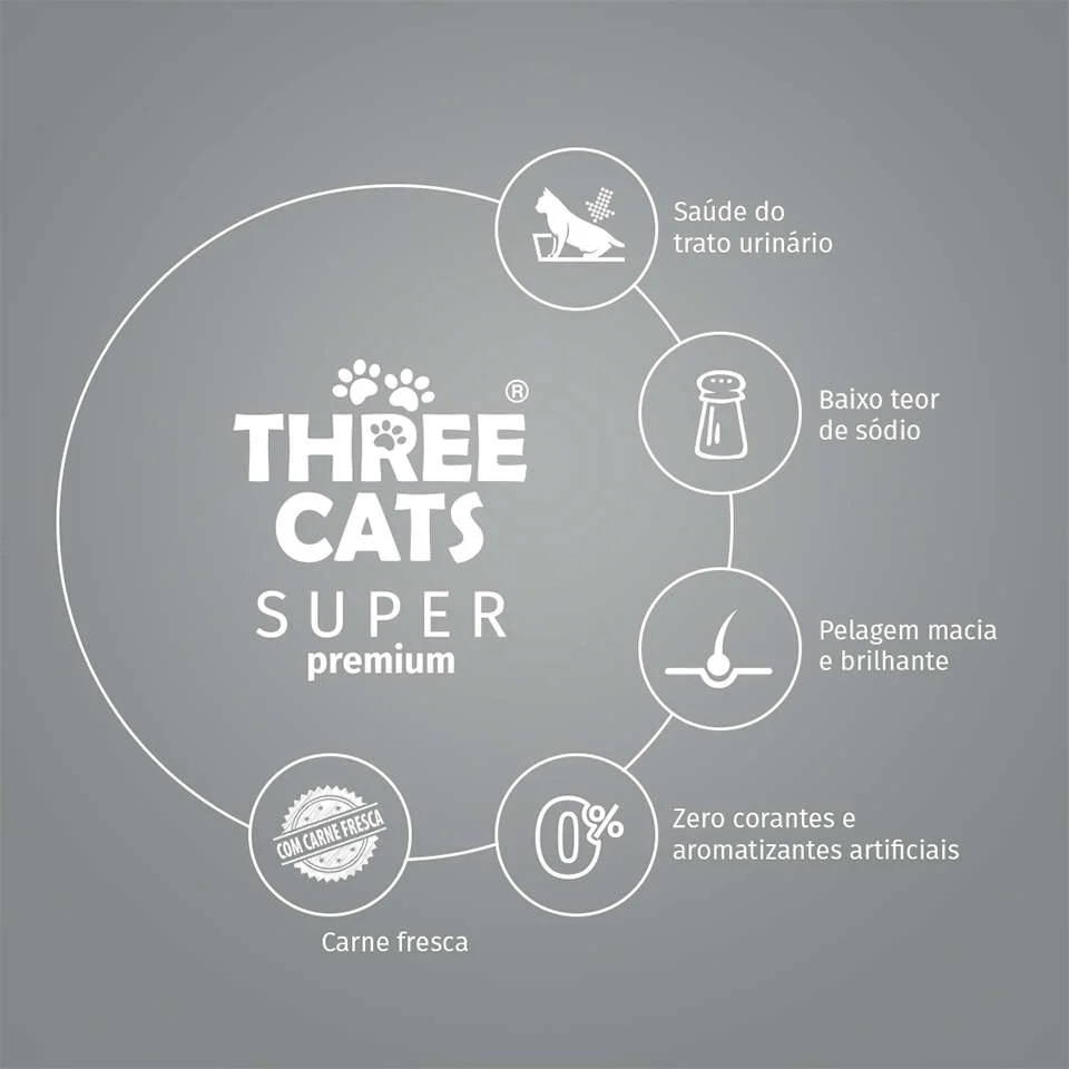 Ração Gatos Three Cats Super Castrados Salmão – 15kg - Indicado para gatos; - Saúde do trato urinário; - Sistema imunológico estimulado; - Fezes firmes e odor. Three Cats Super Premium Adultos Sabor Salmão, Frango e Carne é um alimento rico em ingredientes nobres e de alta qualidade, tais como carnes frescas de frango, peixe e bovina, que fornecem todos os nutrientes necessários de forma equilibrada, do jeito que seu gato precisa para ter uma excelente qualidade de vida. Composição Three Cats Super Premium Adultos Sabor Salmão, Frango e Carne é um alimento rico em ingredientes nobres e de alta qualidade, tais como carnes frescas de frango, peixe e bovina, que fornecem todos os nutrientes necessários de forma equilibrada, do jeito que seu gato precisa para ter uma excelente qualidade de vida.