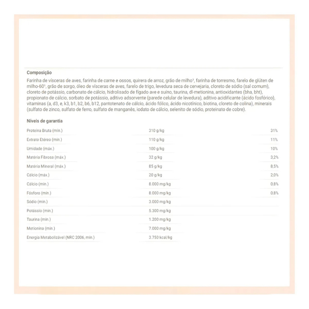 Descrição do Produto:A Ração Choice Gato Adulto Frango & Carne é um alimento seco completo e balanceado, ideal para gatos adultos de todos os portes. Elaborada com ingredientes selecionados, proporciona um sabor irresistível de frango e carne, garantindo a satisfação até dos gatos mais exigentes. Além de sabor, a fórmula oferece suporte à saúde do trato urinário, nutrição equilibrada, rendimento superior e vitalidade prolongada. Benefícios: Contribui para a saúde do trato urinário, com controle adequado de minerais e pH urinário. Nutrição equilibrada que auxilia na formação de fezes firmes. Alta concentração de ingredientes e nutrientes para melhor rendimento por quilo. Vitaminas e minerais que promovem o funcionamento saudável do organismo dos gatos adultos. Ficha Técnica: Tipo de Alimento: Seco Indicação: Gatos Adultos Porte: Todos Sabor: Frango & Carne Peso: 10,1kg Garantia do fabricante: 12 meses Composição Básica:Farinha de Vísceras de Aves, Farinha de Carne e Osso de Bovinos, Quirera de Arroz, Grão de Milho, Farinha de Torresmo, Farelo de Glúten de Milho-60, Grão de Sorgo, Feijão Bandinha, Óleo de Aves, Farelo de Trigo, Cloreto de Sódio, Cloreto de Potássio, Carbonato de Cálcio, Hidrolisado de Fígado de Aves e Suínos, Taurina, DL-Metionina, Antioxidantes (BHA, BHT), Propionato de Cálcio, Sorbato de Potássio, Aditivo Adsorvente (Parede Celular de Levedura e Bentonita), Aditivo Acidificante (Ácido Fosfórico), Vitaminas e Minerais. Níveis de Garantia: Proteína Bruta (mín.): 310g/kg Extrato Etéreo (mín.): 110g/kg Matéria Fibrosa (máx.): 32g/kg Matéria Mineral (máx.): 85g/kg Umidade (máx.): 100g/kg Cálcio (mín.): 8.000mg/kg Cálcio (máx.): 20g/kg Fósforo (mín.): 8.000mg/kg Sódio (mín.): 3.000mg/kg Potássio (mín.): 5.300mg/kg Taurina (mín.): 1.200mg/kg Metionina (mín.): 7.000mg/kg Energia Metabolizável: 3.750kcal/kg Enriquecimento por kg de Produto: Vitamina A: 9.000 UI Vitamina D3: 280 UI Vitamina E: 38 UI Vitamina K3: 0,1mg Vitamina B1: 5,5mg Vitamina B2: 3,2mg Vitamina B6: 2,5mg Vitamina B12: 18μg Pantotenato de Cálcio: 5,8mg Ácido Fólico: 0,75mg Ácido Nicotínico: 32mg Biotina: 0,07mg Colina: 350mg Zinco: 75mg Ferro: 80mg Manganês: 10mg Iodo: 1,8mg Selênio: 0,3mg Cobre: 10mg GREYCOM LTDA - PRODUTOS NOVOS COM NOTA FISCAL E GARANTIA