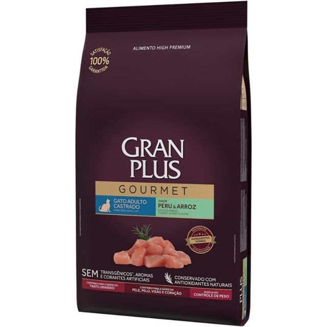 | Ração Gran Plus Gourmet Gatos Castrados Peru e Arroz - 10,1Kg este produto | R$ 174,99 | 10% | 5.0/5 | 15 |