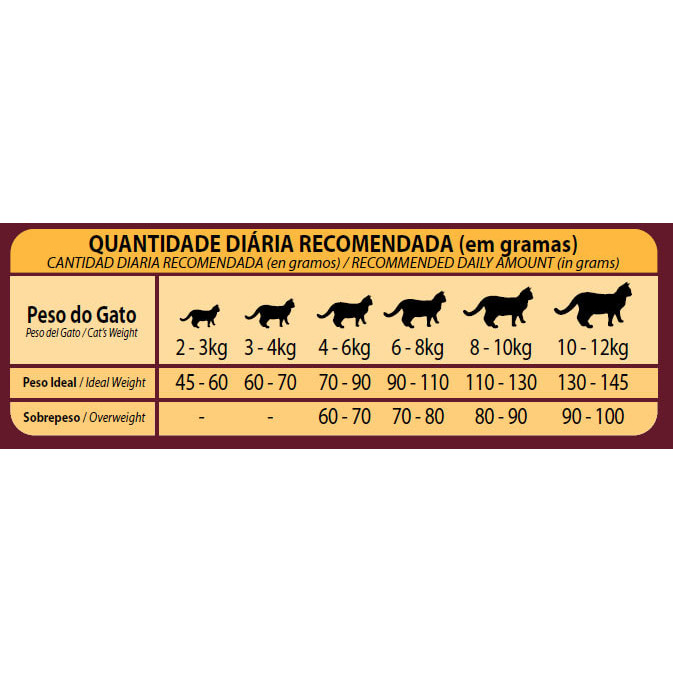 Ração GranPlus Gourmet gatos adultos castrados salmão e frango Pet: Gatos Idade: Adultos Porte de Raça: todos Condição: Gatos Castrados Sabor: Salmão e Frango Tamanho de grão: Específico para gatos Adultos Trangênicos : Não possui trangênicos Quais os benefícios da Ração GranPlus Gourmet gatos adultos castrados salmão e frango? A Ração Granplus Gourmet gatos adultos castrados salmão e frango é um alimento High Premium desenvolvido para gatos que necessitam de uma alimentação equilibrada e balanceada. A Ração Granplus® garante em sua formula um equilibrio em nutrientes e vitaminas que auxiliam no trato e saude urinária, contribui para saúde da pelagem e pele, controle do peso e saúde da visão. Quais os tamanhos das embalagens disponiveis de Ração GranPlus Gourmet gatos adultos castrados salmão e frango? Nas lojas da Poli-Pet você encontra a Ração GranPlus Gourmet gatos adultos castrados peru e arroz nas apresentações de: 1,0kg, 3,0kg, 10,1kg e 10,1kg ind. Quais as rações da linha GranPlus Gourmet Gatos? Na Poli-Pet você encontra a linha da GranPlus Gourmet gatos castrados; GranPlus Gourmet gatos castrados ovelha e arroz, GranPlus Gourmet gatos castrados peru e arroz e GranPlus Gourmet gatos castrados salmão e frango. Qual a diferença da ração GranPlus Gourmet? A linha da de rações gourmet da GranPlus é um uma linha que possui uma qualidade e seleção de ingredientes em sua composição, não contendo conservantes industriais, corantes artificiais, ingredientes trangênicos ou aromatizantes artitificiais. Por que a Ração GranPlus Gourmet gatos adultos castrados salmão e frango é um alimento High Premium ou Premium Especial? Os alimentos High Premium apresentam um nivel nutricional elevado, e atendende os requisitos minimos estabelecidos pelo Conselho de Nutrição Animal, os niveis nutricionais devem estar em equilibrio entre os niveis minimos e maximos apresentados pela AAFCO (Association of American Feed Control Officials). A Ração GranPlus Gourmet gatos adultos castrados salmão e frango foi produzida atendendo todos os requisitos. Esses niveis são determinados pelas pesquisas, que buscam otimas condições de pelagem, desenvolvimento de musculatura e, principalmente, otimização de performance na reprodução e no sistema imunológico. Composição: Ingredientes da Ração GranPlus Gourmet gatos adultos castrados salmão e frango? Carne Mecanicamente Separada de Frango, Fígado de Frango, Farinha Mista de Peru e Frango, Farinha de Vísceras de Aves, Farinha de Torresmo (Farinha de Proteína Isolada de Suíno), Quirera de Arroz, Grão de Milho1, Grão de Sorgo, Óleo de Vísceras de Aves, Farelo de Glúten de Milho-601, Levedura Seca de Cervejaria, Óleo de Peixe Refinado, Óleo de Linhaça, Polpa de Beterraba, Fibra de Cana-de-açúcar, Casca de Aveia, Farelo de Trigo, Cloreto de Sódio (Sal Comum), Calcário Calcítico, Cloreto de Potássio, L-Carnitina, Taurina, L-Lisina, DL-Metionina, Hidrolisado de Fígado Ave e Suíno, Antioxidantes Naturais (Concentrado de Tocoferóis) (mín. 0,03%), Propionato de Cálcio, Sorbato de Potássio, Aditivo Prebiótico (Parede Celular de Levedura – Fonte de Mananoligossacarídeos), Ácido Fosfórico, Aditivo Adsorvente (Parede Celular de Levedura – Glucomananos), Vitaminas (A, D3, E, K3, C, B1, B2, B6, B12, Pantotenato de Cálcio, Ácido Fólico, Ácido Nicotínico, Biotina, Cloreto de Colina), Minerais (Sulfato de Zinco, Sulfato de Ferro, Sulfato de Manganês, Iodato de Cálcio, Selenito de Sódio), Minerais Quelatados (Proteinato de Manganês, Levedura Enriquecida com Selênio, Proteinato de Zinco, Proteinato de Cobre).