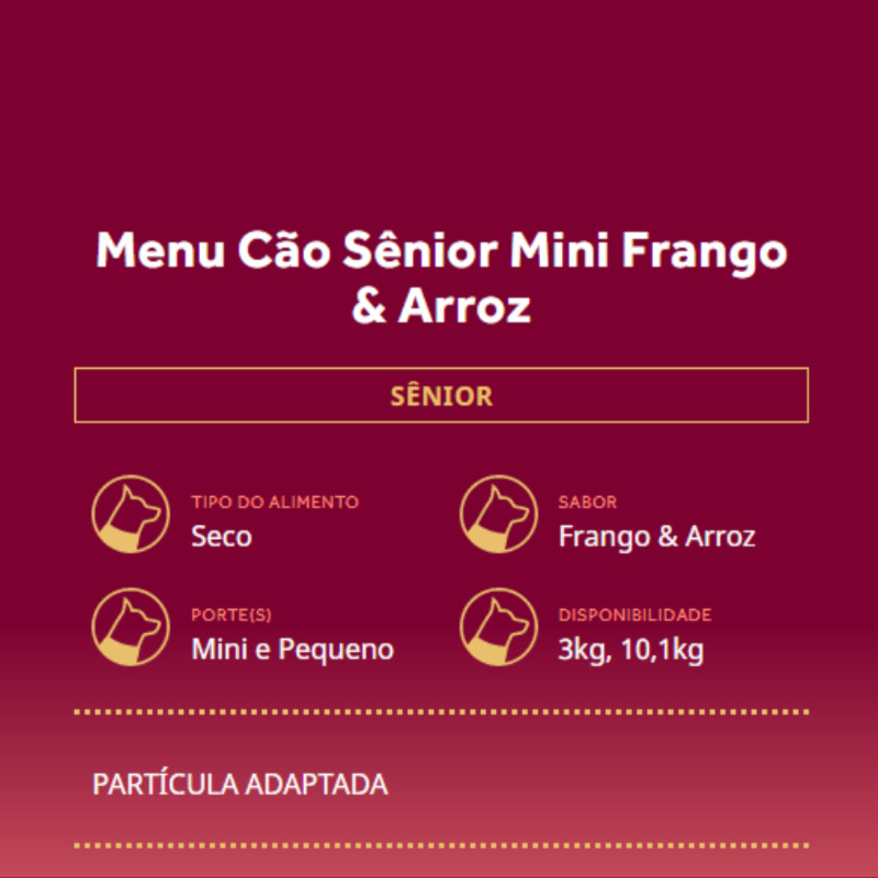Ração GranPlus Menu Cachorro Sênior Mini Sabor Frango e Arroz 3,0kg Pet: Cachorros Idade: Adultos Porte de Raça: Mini Condição: Cachorros na categoria sênior Sabor: Frango e Arroz Transgênicos: Contem ingredientes transgênicos Quais os benefícios Ração GranPlus Menu Cachorro Sênior Mini Sabor Frango e Arroz? A Ração GranPlus Menu Cachorros Sênior Mini Sabor Frango e Arroz é um alimento High Premium ou Premium Especial desenvolvido para cães, garantindo melhor saciedade e a dose certa de nutrientes para seu cachorro, não possui conservantes industriais ou mesmo corantes industriais na sua fórmula. A ração GranPlus garante em sua fórmula a manutenção da saúde intestinal e uma melhor absorção de nutrientes, manutenção das articulações, além de auxiliar no combate a formação de tártaro. A partir de qual idade um cachorro é considerado Sênior? Isso varia conforme o porte do pet, mas entre as raças consideradas "Mini", um Cachorro Pode ser considerado Sênior a partir dos Sete (7) anos. Qual a diferença das rações para cachorros de raças pequenas? As rações para raças pequenas são desenvolvidas para o metabolismo diferenciado dos cachorros de menor porte. Seu metabolismo é mais rápido que das raças de maior porte, necessitando de mais proteínas e gordura em sua composição, além de possuírem um grão adequado a mordedura das raças menores. Por que a Ração GranPlus Menu Cachorro Sênior Sabor Frango e Arroz é um alimento High Premium ou Premium Especial? Os alimentos High Premium apresentam um nível nutricional elevado, e atende os requisitos mínimos estabelecidos pelo Conselho de Nutrição Animal, os níveis nutricionais devem estar em equilíbrio entre os níveis mínimos e máximos apresentados pela AAFCO (Association of American Feed Control Officials). A Ração Granplus Menu Cachorros Sênior Frango e Arroz foi produzida atendendo todos os requisitos. Esses níveis são determinados pelas pesquisas, que buscam ótimas condições de pelagem, desenvolvimento de musculatura e, principalmente, otimização de performance na reprodução e no sistema imunológico. Quais os tamanhos das embalagens disponíveis de Ração GranPlus Menu para Cachorro Sênior Sabor Frango e Arroz? Nas lojas da Polipet você encontra a Ração GranPlus Menu Cachorro Sênior Frango e Arroz nas apresentações de: 3,0kg e 15,0kg. Quais as diferenças entre as rações para cachorros adultos ou para cachorros sêniores? A alimentação para cães varia muito conforme a sua fase da vida. Rações para filhotes tem uma quantidade maior de proteínas, cálcio e energia para auxiliar no seu desenvolvimento, cães adultos não necessitam de tantos nutrientes quanto os filhotes. Já cachorros na categoria sênior (categoria que varia muito conforme o porte do cão) necessitam de nutrientes específicos, menos gordura, mais vitaminas para a manutenção das articulações e prolongamento jovialidade do organismo. As rações sênior são bem balanceadas entre os nutrientes necessários para a manutenção do seu organismo, além de não possuírem corantes e conservantes industriais, e seu grão apresentam uma dureza mais adequada. Composição: Ingredientes da Ração GranPlus Menu para Cachorros Sênior Mini Sabor Frango e Arroz? Farinha de Vísceras de Aves (mín. 10%), Farelo de Glúten de Milho-601, Quirera de Arroz, Milho Integral Moído1, Sorgo Integral Moído, Gordura Animal Estabilizada, Óleo de Peixe Refinado, Óleo de Linhaça (mín. 0,1%), Polpa de Beterraba (mín. 0,2%), Farelo de Trigo, Levedura Seca de Cervejaria, Cloreto de Sódio (Sal Comum), Cloreto de Potássio, Hidrolisado de Fígado Ave e Suíno, Aditivo Prebiótico (Parede Celular de Levedura – Fonte de Mananoligossacarídeos, mín. 0,1%), Hexametafosfato de Sódio (mín. 0,6%), Sulfato de Glicosamina (mín. 0,01%), Sulfato de Condroitina (mín. 0,005%), Antioxidantes (BHA, BHT), Ácido Propiônico, Sorbato de Potássio, Aditivo Adsorvente, Vitaminas (A, D3, E, K3, C, B1, B2, B6, B12, Ácido Pantotênico, Ácido Fólico, Niacina, Biotina, Cloreto de Colina), Minerais (Sulfato de Zinco, Sulfato de Ferro, Sulfato de Manganês, Iodato de Cálcio, Selenito de Sódio), Minerais Quelatados (Proteinato de Manganês, Levedura Enriquecida com Selênio, Proteinato de Zinco, Proteinato de Cobre).