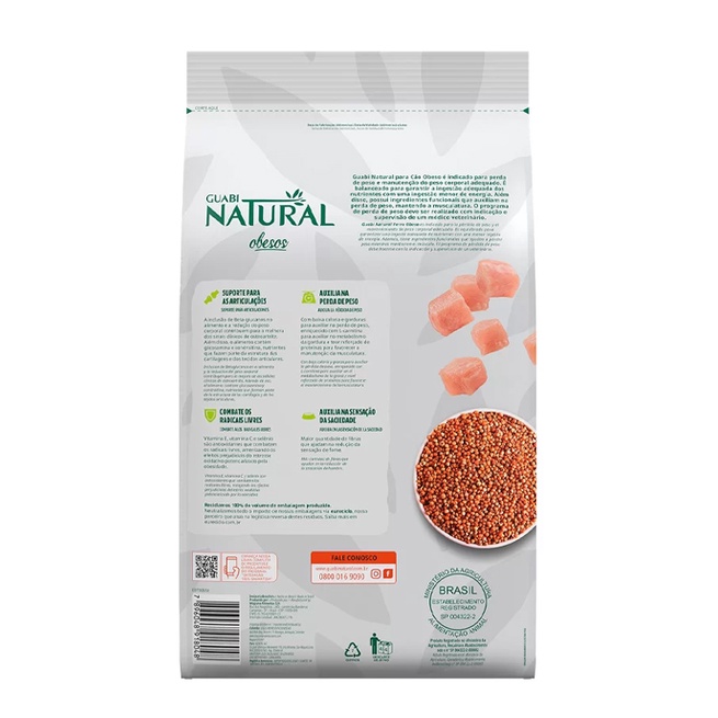 Ração Guabi Natural Cães Obesos Raças Mini e Pequenas 10,1kg - Indicada para cães obesos; - Nutrição animal; - Perda de peso; - Produto natural. A Ração Guabi Natural Cães Obesos é uma linha de alimentos super premium para cães que alia os mais recentes avanços tecnológicos em nutrição animal com o melhor da natureza. Alimento balanceado para a ingestão adequada dos nutrientes com uma ingestão menor de energia com queima da gordura corporal. Além disso, possui ingredientes que auxiliam na perda de peso mantendo a musculatura. Ideal para cãezinhos obesos. O produto conta com ingredientes que ajudam na perda de massa gorda e na manutenção da massa muscular. Importante lembrar que a ração deve ser recomendada por um médico veterinário. Produto natural sem conservantes químicos e sem corantes. É conservado naturalmente com essência de alecrim, vitamina E e ácido cítrico. Composição Carne Mecanicamente Separada de Frango, Fígado de Frango, Farinha de Vísceras de Aves, Farinha de Torresmo, Ovo em Pó, Farinha de Salmão, Óleo de Aves, Óleo de Peixe Refinado, Arroz Integral, Grão de Aveia, Cevada em Grão, Grão de Sorgo, Ervilha, Brócolis Desidratado, Espinafre Desidratado, Cenoura Desidratada, Mirtilo Desidratado Blueberry, Amora Desidratada, Maçã Desidratada, Manga Desidratada, Polpa de Beterraba, Farinha da Alga Schizochytrium sp., Semente de Psyllium, Casca de Aveia Moída, Casca de Ervilha Moída, Fibra de Cana-de-Açúcar, Levedura Seca de Cervejaria, Cloreto de Potássio, Carbonato de Cálcio, Sulfato de Glicosamina, Sulfato de Condroitina, Parede Celular de Levedura Fonte de Beta-Glucanos, Hidrolisado de Fígado de Aves e Suínos, Hexametafosfato de Sódio, Extrato de Yucca, L-Lisina, Taurina, DL-Metionina, L-Carnitina, L-Triptofano, Propionato de Cálcio, Sorbato de Potássio, Aditivos Prebióticos (Inulina e Parede Celular de Levedura Fonte de Mananoligossacarídeos), Antioxidantes Naturais (Extrato de Alecrim e Concentrado de Tocoferóis), Aditivo Adsorvente (Parede Celular de Levedura e Bentonita), Vitamina A, Vitamina D3, Vitamina E, Menadiona Bissulfito de Sódio (Vitamina K3), Ácido Ascórbico (Vitamina C), Mononitrato de Tiamina (Vitamina B1), Riboflavina (Vitamina B2), Piridoxina (Vitamina B6), Vitamina B12, Pantotenato de Cálcio, Ácido Fólico, Ácido Nicotínico, Biotina, Cloreto de Colina, Sulfato de Zinco, Sulfato de Ferro, Sulfato de Manganês, Iodato de Cálcio, Proteinato de Manganês, Levedura Enriquecida com Selênio, Proteinato de Zinco, Proteinato de Cobre, Cromo Levedura.