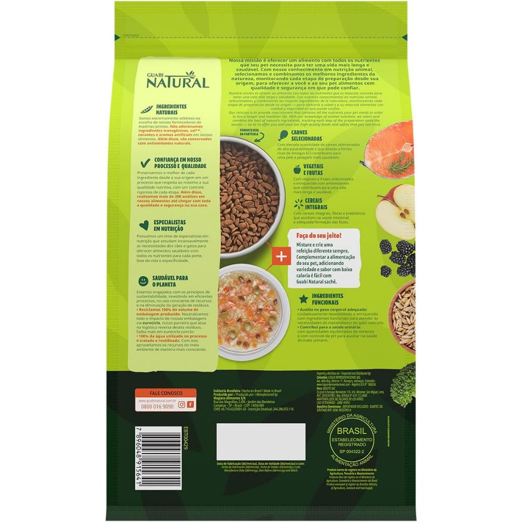 Ração Guabi Natural Gatos Castrados Salmão e Cevada - 7,5Kg - Indicado para gatos castrados; - Equilíbrio corporal; - Proteção para o organismo; - Saúde e qualidade de vida. A Ração Guabi Natural Gato Castrado Salmão e Cevada é um alimento Super Premium feito com carnes selecionadas e ingredientes essenciais, que contribuem para qualidade de vida do seu gatinho. Além disso, foi desenvolvido por especialistas em nutrição e aprovado por veterinários para fornecer muito sabor e toda qualidade e saúde para os felinos castrados. Sem transgênicos, corantes e aromas artificiais, Guabi Natural Gato Castrado, tem o saboroso sabor de Salmão e Cevada. Condição corporal equilibrada, com elevada quantidade de carnes e proteínas exclusivamente animais que proporcionam os nutrientes essenciais para a adequada condição corporal de cada fase de vida; Ingredientes Seleção de Ingredientes de Origem Animal, mín. 62% (dos quais mín. 16% são Carnes Selecionadas: Carne de Salmão, Carne Mecanicamente Separada de Frango e Fígado de Frango; Farinha de Vísceras de Aves, Farinha de Torresmo "Proteína Isolada de Suíno", Ovo em Pó, Gelatina "Colágeno Hidrolisado", Óleo de Vísceras de Aves, Gordura Suína, Óleo de Peixe Refinado, Hidrolisado de Fígado Ave e Suíno). Seleção de Cereais Integrais, mín. 28% (Arroz Integral, Grão de Aveia, Cevada em Grão, Grão de Sorgo). Seleção de Frutas, Vegetais, Vitaminas, Minerais e Ingredientes Funcionais, máx. 10% (dos quais máx. 5% são Frutas e Vegetais Selecionados: Ervilha, Brócolis Desidratado em Pó, Espinafre Desidratado, Cenoura Desidratada, Extrato de Mirtilo "Blueberry", Amora Desidratada, Maçã Desidratada, Manga Desidratada, Polpa de Beterraba, Farinha da Alga Schizochytrium sp., Semente de Psyllium, Fibra de Cana-de-Açúcar, Casca de Aveia, Levedura Seca de Cervejaria, Óleo de Linhaça; Cloreto de Sódio "Sal Comum", Cloreto de Potássio, Carbonato de Cálcio; Aditivos Prebióticos, mín. 0,35%: Inulina e Parede Celular de Levedura Fonte de Mananoligossacarídeos; Concentrado de Tocoferóis mín. 0,08%, L-Lisina, Taurina, DL-Metionina, L-Carnitina, Propionato de Cálcio, Sorbato de Potássio, Aditivo Adsorvente, Aditivo Acidificante; Vitaminas: A, D3, E, K3, C, B1, B2, B6, B12, Ácido Pantotênico, Ácido Fólico, Niacina, Biotina, Cloreto de Colina; Minerais: Sulfato de Zinco, Sulfato de Ferro, Sulfato de Manganês, Iodato de Cálcio, Selenito de Sódio; Minerais Quelatados: Proteinato de Manganês, Levedura Enriquecida com Selênio, Proteinato de Zinco, Proteinato de Cobre).