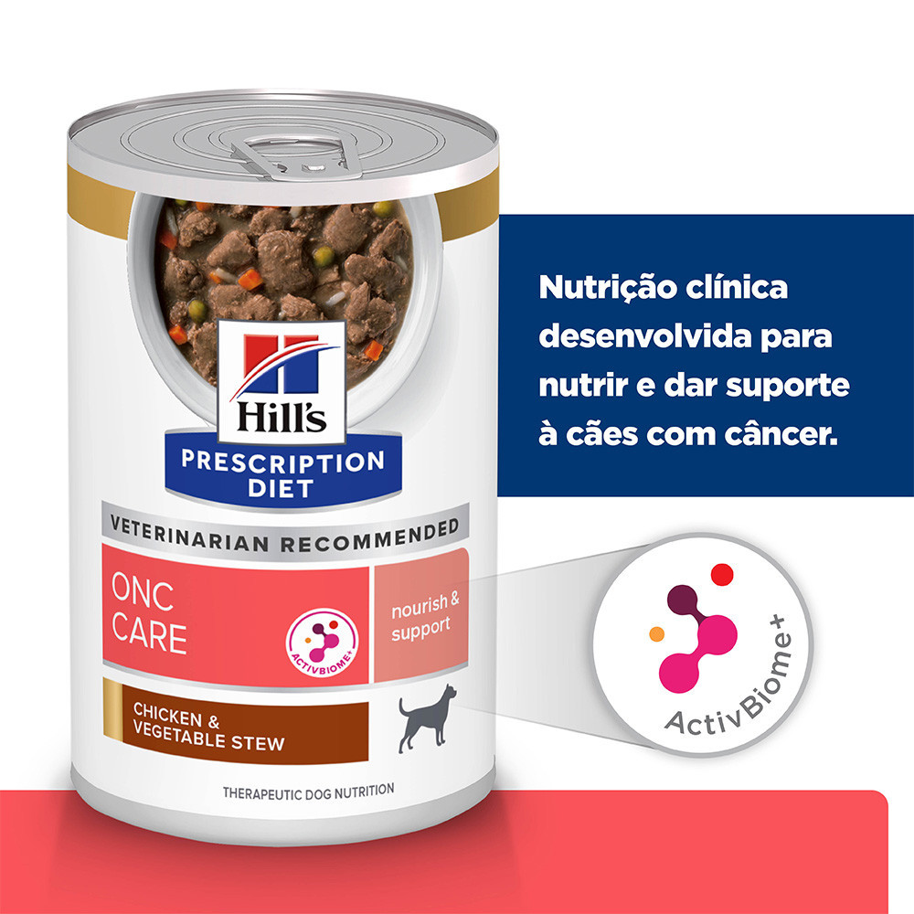 Ração Hill s para Cães Prescription Diet On-Care Lata 342g - Indicado paa cães; - Alimento úmido; - Com chicken e vegetais; - Mantém a força e a energia com ingredientes repletos de nutrientes; - Desenvolvido por nutricionistas e veterinários especializados; - Nutrientes altamente digeríveis e absorvíveis para força e energia ideais. Quando os cães têm câncer, é essencial garantir que suas necessidades nutricionais sejam atendidas, os alimentos terapêuticos para cães com câncer têm como objetivo ajudar a manter a força e a energia, além de estimular o consumo de alimentos desde a primeira tigela. Os nutricionistas e veterinários da Hill s desenvolveram a nutrição clínica Hill s Prescription Diet ONC Care para ajudar especificamente a nutrir e apoiar cães que lutam contra o câncer, esta refeição húmida é feita com frango e vegetais e foi concebida para ser a nossa nutrição mais saborosa, com gorduras saborosas e proteínas altamente digeríveis. Os nutrientes altamente digeríveis do Prescription Diet ONC Care são fáceis de serem absorvidos pelos animais de estimação e a fórmula também contém ActivBiome +, uma mistura patenteada de fibras prebióticas para apoiar um microbioma gastrointestinal saudável e demonstrou fornecer qualidade consistente das fezes. Composição Caldo de galinha, fígado de porco, frango, cenoura, ervilha, arroz, amido de arroz, glúten de trigo, óleo de soja, sabor hidrolisado de frango, sabor de fígado de frango, óleo de peixe, alginato de potássio, cascas de nozes moídas, óleo de coco, cloreto de cálcio, gordura de frango, produto de ovo, linhaça, polpa de beterraba seca, polpa cítrica seca, goma guar, fosfato dicálcico, lactato de cálcio, gluconato de cálcio, vitaminas (suplemento de vitamina E, L-ascorbil-2-polifosfato (fonte de vitamina C), mononitrato de tiamina, suplemento de niacina , pantotenato de cálcio, suplemento de vitamina B12, cloridrato de piridoxina, biotina, suplemento de vitamina D3, suplemento de riboflavina, ácido fólico), fosfato monossódico, cranberries prensados, cloreto de colina, taurina, tripolifosfato de sódio, óxido de magnésio, minerais (sulfato ferroso, óxido de zinco, cobre Sulfato, Sulfato de Manganês, Iodato de Cálcio), L-Triptofano, Sabores Naturais, L-Carnitina, Betacaroteno.