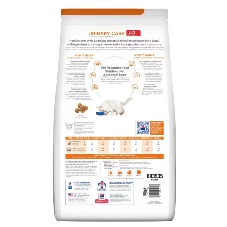Ração Hills Prescription C/d Multicare Stress Urinario Gatos Adultos 3.85kg A Ração Seca Hills Prescription Diet C/d Multicare Cuidado Urinário para gatos Adultosé a solução clinicamente comprovada que cuida da saúde do trato urinário do seu amigo de quatro patas adulto, agindo diretamente na prevenção e tratamento dos problemas mais comuns, especialmente oscálculos de estruvita.Seu amigo merece uma vida plena, livre de desconfortos urinários! Desenvolvida por nutricionistas e veterinários, esta ração terapêutica é essencial para: Dissolver Cálculos de Estruvita:Sua fórmula especializada trabalha ativamente paraeliminar as pedras urinárias existentes, trazendo alívio para seu felino. Prevenir Novas Formações:Reduz o risco de surgimento de novos cristais, tanto de estruvita quanto de oxalato de cálcio, os tipos mais frequentes. Criar um Ambiente Urinário Saudável:Promove o equilíbrio ideal do pH da urina, inibindo a formação de cristais. Gerenciar o Estresse:Ajuda a controlar o estresse, um fator importante em problemas urinários. Sabor Irresistível:Feita com ingredientes de alta qualidade, garantimos que seu felino vai adorar cada refeição. Com aRação Seca Hills Prescription Diet C/d Multicare Cuidado Urinário para gatosAdultos, você oferece mais que nutrição; você entrega o cuidado especializado que seu felino precisa para ter um trato urinário saudável, muito mais conforto e uma vida feliz. Converse com seu médico-veterinário para mais informações decomo essa ração pode transformar a saúde do seu pet!