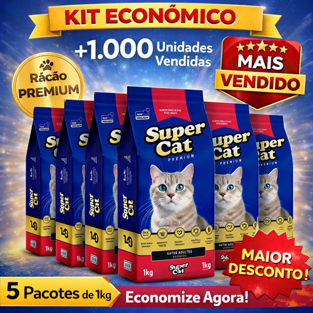 | RAÇÃO Kit 5 Super Cat – 5×1 kg | Sabor Carne e Peixe Contém Taurina... este produto | R$ 47,90 | 26% | 5.0/5 | — |