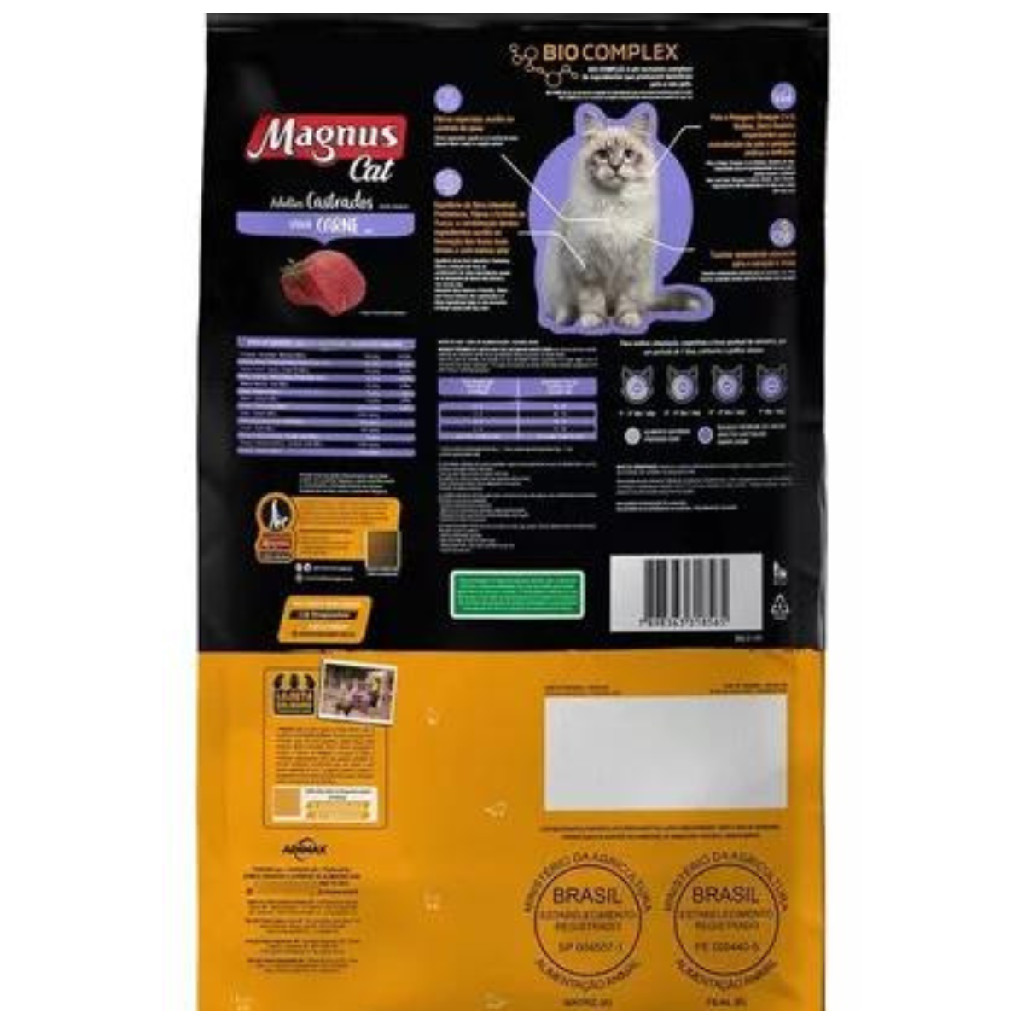 Ração Magnus Premium Gatos Adultos Castrados Carne 10,1kg Ração Seca Magnus cat sabor carne para gatos adultos castrados A seleção de um alimento adequado para o seu animal de estimação é muito importante para garantir o seu crescimento, o desenvolvimento e a saúde. Com esta opção da Magnus você poderá cobrir as necessidades nutricionais e energéticas do seu gato. Seu animal de estimação sempre saudávelUma alimentação balanceada é essencial para que o seu fiel companheiro se mantenha saudável e forte. A dieta do seu gato é refletida na sua pelagem, por isso é de vital importância que contenha todos os nutrientes necessários para o seu crescimento. Garanta a energia e a vitalidade do seu amigo para que ele possa correr, pular e jogar o dia todo.Benefícios do alimento secoA maior vantagem do alimento seco para animais de estimação é que ele pode ser armazenado por muito mais tempo sem se deteriorar e evita o aparecimento de fungos ou bactérias. Além disso, este tipo de alimento ajuda a remover o tártaro e atrasar a formação da placa dentária com o processo de mastigação e trituração.Proteína para uma nutrição completaAlimento rico em proteína animal de alto valor biológico, contém minerais como cálcio, fósforo, potássio e ferro, vitaminas A, D e E, fibras e ácidos graxos essenciais. Estes nutrientes promovem o fortalecimento do sistema imunológico do seu animal de estimação e o bom funcionamento de seus sistemas vitais. Além disso, contribuem para a saúde da sua pelagem, pele e unhas e para a manutenção de seus tendões, músculos e ossos.