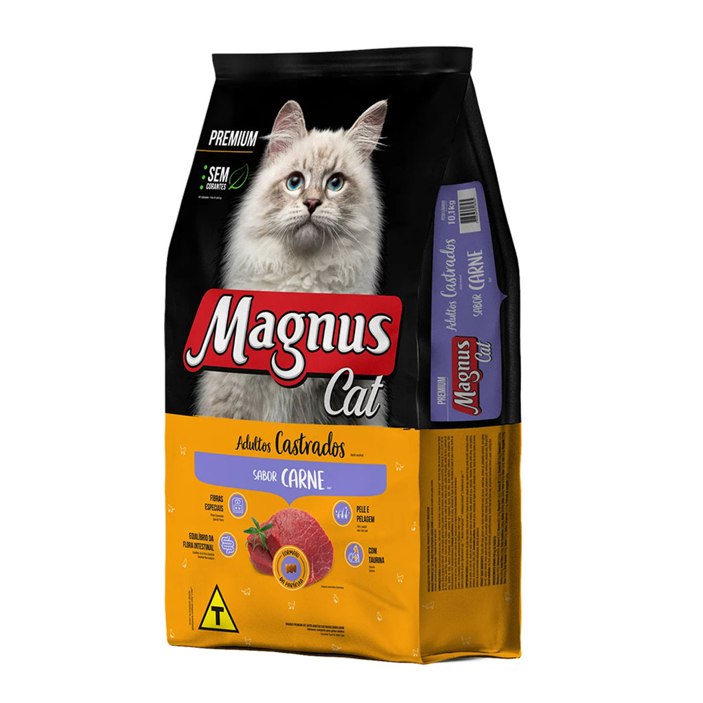 Ração Magnus Premium Para Gatos Adultos Castrados Carne 1kg - Indicado para gatos adultos; - Equilíbrio da flora intestinal; - Vitaminas e minerais; - Com vitaminas ideais para gatos castrados; - Proteína de alta qualidade. A Magnus Cat Premium Gatos é um alimento completo, fresco, preparado com ingredientes de alta qualidade. Nutritivo e saboroso, agrada ao paladar diferenciado do gato promovendo benefícios a sua vida. Com níveis de ingredientes ideias para gatos castrados. A linha sem corante conta com proteínas de alta qualidade e altamente digestível. Além disso por ter prebióticos, firbas e extrato de Yucca, coopera para o equilíbrio da flora intestinal para o seu gato ter longevidade. Rica em vitaminas e minerais para um crescimento adequado e ajuste do pH urinário. Com Taurina aminoácido essencial para o coração e a visão. Ingredientes Farinha de vísceras de aves, milho moído*, farinha de carne e ossos de bovino, farelo de soja**, farelo de trigo, óleo de aves, hidrolisado de fígado de suíno, farelo de glúten de milho-60*, cloreto de sódio, grão de linhaça, parede celular de levedura, inulina, extrato de yucca (0,03%), vitaminas (A, D3, E, K3, B1, B2, B5, B6, B12, biotina, ácido fólico, niacina, cloreto de colina), minerais (sulfato de ferro, sulfato de cobre, iodato de cálcio, sulfato de manganês, sulfato de zinco, proteinato de zinco, selenito de sódio, levedura enriquecida com selênio, proteinato de manganês), taurina, ácido cítrico, ácido fosfórico, metionina, ácido propiônico, BHA (Butilhidroxianisol) e BHT (Butilhidroxitolueno). Eventuais substitutivos: farelo de arroz, hidrolisado de fígado de aves, hidrolisado de fígado de aves e suíno, farinha de carne e ossos de suíno, farinha de carne e ossos de aves, levedura de cervejaria inativada desidratada, farinha de torresmo. Contém, na composição, alimento geneticamente modificado: milho* e soja**. Espécies doadoras de gene: Agrobacterium spp.* **, Bacillus thuringiensis* **, Arabidopsis thaliana** e Streptomyces spp.* **.