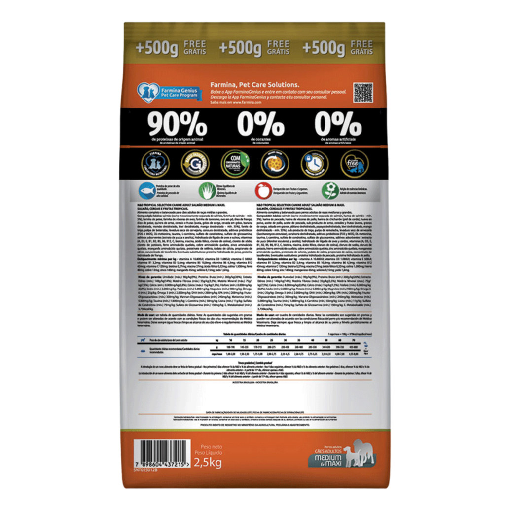 Ração N&D Tropical Selection Cães Adultos 2kg + 500g Grátis Porte Mini e Pequeno Sabor Salmão, Cereais e Frutas Tropicais Pet: Cães; Indicada para cães adultos de raças mini e pequena; 90% de proteínas de origem animal; 0% de corantes e aromas artificiais; Com conservantes naturais; Livre de transgênicos; Tecnologia vacuum coater e feita em atmosfera controlada; Disponível em embalagem de 2kg + 500g grátis; Enriquecida com vitaminas e minerais essenciais; Código de barras: 7898604437246. A ração N&D Tropical Selection é ideal para cães adultos de raças mini e pequena. Desenvolvida para oferecer uma nutrição completa e balanceada, esta ração garante um desenvolvimento saudável para os cães e suporte nutricional essencial. Qualidade e Ingredientes Naturais Com 90% de proteínas de origem animal, a N&D Tropical Selection assegura uma dieta rica em nutrientes essenciais. Além disso, a fórmula é livre de corantes e aromas artificiais, utilizando apenas conservantes naturais. A ausência de transgênicos na composição reflete um compromisso com a saúde dos animais, proporcionando uma alimentação mais natural e segura. Tecnologia Avançada de Produção A N&D utiliza tecnologia vacuum coater em sua produção, um processo que melhora a absorção dos nutrientes pela ração. Feita em atmosfera controlada, a ração mantém a frescura e a qualidade dos ingredientes. Esta tecnologia garante que os nutrientes permaneçam intactos até o momento do consumo. Vitaminas e Minerais Essenciais A ração N&D Tropical Selection é enriquecida com vitaminas e minerais vitais para o desenvolvimento dos cães. Contém vitamina A, D3, E, B1, B2, B5, B6, B12, C, biotina, niacina, ácido fólico, colina, ferro, cobre, zinco, manganês, selênio e iodo. Esses nutrientes são fundamentais para a saúde geral, crescimento ósseo, sistema imunológico e função metabólica dos cães. Composição Balanceada A composição da ração inclui cordeiro, cereais, frutas e outros ingredientes de alta qualidade. Entre os principais componentes estão: Cereais e frutas (mín. 35%) como aveia, grãos de sorgo, cevada, banana, mamão, kiwi e manga desidratados Farinha de vísceras de aves, farinha de torresmo, ovo em pó, quirera de arroz e farelo de trigo Óleo de frango e óleo de peixe para ácidos graxos essenciais Aditivos prebióticos como FOS e MOS para a saúde digestiva Suplementos como sulfato de condroitina e sulfato de glicosamina para a saúde articular Embalagem Conveniente A ração N&D Tropical Selection está disponível em uma embalagem prática de 2kg, com um adicional de 500g grátis. Esta quantidade é ideal para garantir a frescura e a qualidade da ração ao longo do tempo. Composição salmão (carne mecanicamente separada de salmão, farinha de salmão – mín. 5%), farinha de peixe, farinha de vísceras de aves, farinha de torresmo, ovo em pó, óleo de frango, óleo de peixe, quirera de arroz, cereais e frutas (aveia, grãos de sorgo, cevada em grãos, banana desidratada, mamão desidratado, kiwi desidratado, manga desidratada – mín. 35%), farelo de trigo, polpa de beterraba, levedura seca de cervejaria, cenoura desidratada, aditivos prebióticos (FOS e MOS), DL-metionina, taurina, L-carnitina, sulfato de condroitina, sulfato de glicosamina, aditivos adsorventes (extrato de yucca e zeolita), hidrolisado de fígado de aves e suínos, vitaminas (A, D3, E, B1, B2, B5, B6, B12, C, biotina, niacina, ácido fólico, cloreto de colina), cloreto de sódio, cloreto de potássio, ferro aminoácido quelato, cobre aminoácido quelato, zinco aminoácido quelato, manganês aminoácido quelato, proteinato de selênio, iodato de cálcio, propionato de cálcio, concentrado de tocoferóis. Eventuais substitutivos: proteína hidrolisada de peixe, proteína hidrolisada de frango. Enriquecimento por kg: Vitamina A 10.800UI; vitamina D3 1.080UI; vitamina E 500UI; vitamina B1 3,2mg; vitamina B2 5,4mg; vitamina B5 10,8mg; vitamina B6 4,3mg; vitamina B12 43mcg; vitamina C 120mg; biotina 0,27mg; niacina 27mg; ácido fólico 0,32mg; colina 1.500mg; ferro 40mg; cobre 12mg; zinco 140mg; manganês 45mg; selênio 0,15mg; iodo 1,6mg.