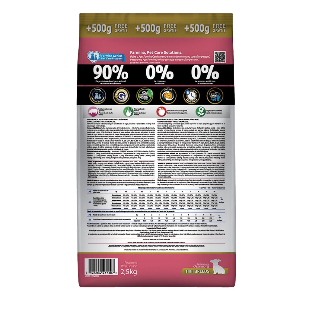 Ração N&D Tropical Selection Para Cães Puppy Mini Suino Leve 2,5kg e Pague 2kg - Indicado para filhotes de porte pequeno; - Promove pelagem saudável e energia; - Ingredientes selecionados de alta qualidade; - Suporte ao crescimento saudável e desenvolvimento; - Nutrição completa e equilibrada para filhotes. O sabor suíno torna as refeições dos filhotes irresistíveis, incentivando o consumo e garantindo que recebam os nutrientes essenciais, a fórmula da ração incorpora ingredientes cuidadosamente escolhidos para proporcionar uma nutrição premium, contribuindo para o crescimento saudável e o desenvolvimento do seu filhote. Ela oferece proteínas de alta qualidade que auxiliam no desenvolvimento muscular e fornecem energia essencial. Além disso, os ingredientes selecionados também promovem a saúde da pele, pelagem e vitalidade dos filhotes.