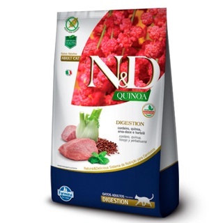 Ração N&D Quinoa Gatos Adultos Cordeiro Digestion – 7,5Kg - Indicado para gatos; - Ajuda na digestão; - Com carne fresca; - Alta qualidade. A Ração N&D Quinoa é um alimento equilibrado e completo, indicado pra gatos com sensibilidade digestiva. Feito com carne de cordeiro. Sua fórmula conta com Quinoa e ainda é enriquecida com frutas e legumes. A Ração conta com adição de essências botânicas. O seu pet terá uma ótima digestão!! Modo de usar Ver tabela de quantidades diárias. Nota: As quantidades são sugeridas em gramas e podem ser alteradas de acordo com as condições físicas do cão e/ou recomendação do Médico Veterinário. Deixe sempre água fresca e limpa ao alcance de seu cão e leve-o regularmente ao Médico Veterinário. Composição carne de cordeiro, farinha de carne e ossos de ovino (mín. 3%), farinha de vísceras de aves, ovo desidratado, quinoa (mín. 8%), amido de batata, óleo de frango, óleo de peixe, polpa de beterraba, psyllium, levedura de cerveja, erva-doce desidratada (mín. 0,15%), hortelã desidratada (mín. 0,15%), extrato de chá verde, extrato de aloe vera, betacaroteno, luteína, fruto-oligossacarídeos, mannan-oligossacarídeos, DL-metionina, taurina, L-carnitina, sulfato de condroitina, sulfato de glucosamina, extrato de yucca, zeolita, hidrolisado de fígado de frango e/ou suíno, vitaminas (A, D3, E, K3, B1, B2, B6, B12, C, biotina, niacina, ácido pantotênico, ácido fólico, cloreto de colina), cloreto de potássio, carbonato de cálcio, fosfato bicálcico, ácido fosfórico, ferro orgânico, cobre orgânico, zinco orgânico, manganês orgânico, selênio orgânico, iodato de cálcio, propionato de cálcio, antioxidante natural (concentrado de tocoferóis). Eventual substitutivo: proteína hidrolisada de peixe.