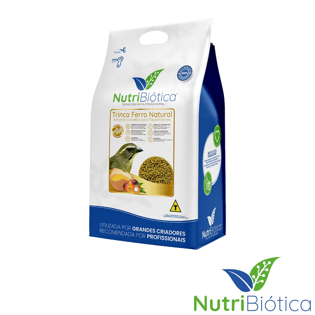 Descrição: A Nutribiótica Super Premium Trinca Ferro Natural é um alimento completo e balanceado para passeriformes nas fases de manutenção e reprodução. Embalagens plásticas com barreira luz e oxigênio de 300g. Composição Básica: Milho Moído*, Quirera de Arroz, Farelo de Soja**, Grão de Aveia, Farelo de Glúten de Milho 60*, Grão de Linhaça, Larva de Mosca Soldado Negra Desidratada, Semente de Cártamo, Óleo de Girassol Bruto, Gordura de Coco (0,5%), Azeite de Dendê (0,5%), Ovo em pó, Alho Desidratado (0,1%), Biomassa de Microalgas desidratada (Spirulina Platensis) , Biomassa de Microalgas (Schizochytrium sp.), Cloreto de Sódio, Prebióticos (Frutooligossacarídeos-FOS e Mananoligossacarídeos-MOS), Óleos Essenciais (Orégano, Canela), Ácido Fólico, DPantotenato de Cálcio, Biotina, Vitamina C, Niacina, Cloreto de Colina, Vitamina A, Vitamina B1 (Tiamina), Vitamina B2 (Riboflavina), Vitamina B6 (Piridoxina), Vitamina B12, Vitamina D3, Vitamina E, Vitamina K3 (Menadiona), Inositol, Ferro Quelato, Cobre Quelato, Iodato de Cálcio, Sulfato de Cobalto, Sulfato de Manganês, Manganês Quelatado, Zinco Quelatado, Selênio Quelatado, Picolinato de Cromo, Calcário Calcítico, Fosfato Bicálcico, Sorbato de Potássio, Zeólita (1,5%), Ácido Cítrico, BHA, BHT, Aroma de Melaço, Aroma de Abacaxi. Espécies doadoras de genes: *Streptomyces viridochromogenes, Bacillus thuringiensis. **Agrobacterium tumefaciens. Ingredientes fixos sem eventuais substitutivos. Níveis de Garantia: Umidade (Máx.) 100g/kg Proteína Bruta (Mín.) 210g/kg Extrato Etéreo (Mín.) 50g/kg Matéria Fibrosa (Máx.) 50g/kg Matéria mineral (Máx.) 40g/kg Cálcio (Máx.) 9.000mg/kg Cálcio (Mín.) 6.000mg/kg Fósforo (Mín.) 4.500mg/kg Ômega 3 (Mín.) 8.000mg/kg Ômega 6 (Mín.) 27g/kg DHA (Mín.) 250mg/kg MOS (Mín.) 1.000mg/kg FOS (Mín.) 1.000mg/kg Modo de uso: A Nutribiótica Super Premium Trinca Ferro Natural é um alimento completo e balanceado para passeriformes nas fases de manutenção e reprodução. Enriquecimento por kg: Vitamina A (Mín.) 18.000UI, Vitamina D3 (Mín.) 1.800UI, Vitamina E (Mín.) 225UI, Vitamina C (Mín.) 900mg, Vitamina B1 (Mín.) 7,0mg, Vitamina B2 (Mín.) 12,0mg, Vitamina B6 (Mín.) 12,0mg, Vitamina B12 (Mín.) 45,0mcg, Vitamina K3 (Mín.) 4,5mg, Ácido Fólico (Mín.) 3,6mg, Ácido Pantotênico (Mín.) 60,0mg, Biotina (Mín.) 0,6mg, Niacina (Mín.) 104mg, Colina (Mín.) 748mg, Inositol (Mín.) 225mg, Cobre quelatado (Mín.) 77,0mg, Ferro quelatado (Mín.)30,0mg, Iodo (Mín.) 1,94mg, Manganês (Mín.) 120mg, Manganês quelatado (Mín.) 30,0mg, Selênio quelatado (Mín.) 0,75mg, Zinco quelatado (Mín.) 173mg, BHT (Mín.) 120mg, BHA (Mín.) 125mg, Cobalto (Mín.) 0,18mg, Cromo (Mín.) 0,35mg.