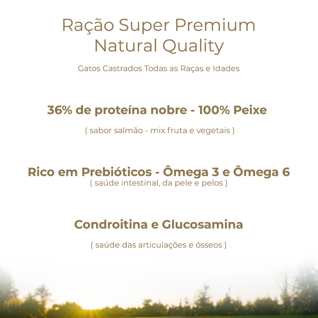Loja Nutrimais Fabricante de Suplementos e Rações. Ração Nutrimais Gatos Castrados: Fórmula com Proteína nobre de peixe com alta digestibilidade para todos os gatos, filhotes e adultos. Alimento Completo Super Premium Natural. Diferenciais: - Ingredientes selecionados - Baixo em carboidratos - Altamente palatável - Sabor salmão - 36% proteína - 0% transgênico - 0% corantes - 0% aromatizante - 0% Aditivos Rico em: - Prebióticos, Omega 3 e Omega 6 para pelos brilhantes e sedosos. - Condroitina e Glucosamina para manutenção das articulações e ósseos, além de fornecer energia. - Extrato de yucca + prebióticos para imunidade e equilíbrio intestinal. Composição: Farinha de peixes (Tilápia), Ovo em pó, Óleo de aves, Óleo de salmão, Quirera de arroz, Blueberry (mirtilo) em pó, Farinha de batata doce, Grão de linhaça, Levedura de cerveja inativada desidratada, Hidrolisado de fígado de suínos e aves, Prebióticos, Taurina, L-carnitina, Dl-metionina, L-lisina, Ácido fólico, Ácido pantotênico, Biotina, Cloreto de colina, Vitamina A, Vitamina D3, Vitamina E, Vitamina K3, Vitamina B1, Vitamina B2, Vitamina B6, Vitamina B12, Sulfato de cobre, ferro, manganês e Zinco orgânico, Extrato de yucca. Fórmula: Umidade (máx.) 100,00 g/kg Proteína bruta (mín.) 360,00 g/kg Extrato etéreo (min. ) 100,00 g/kg Matéria fibrosa (max. ) 45,00 g/kg Matéria mineral (máx.) 80,00 g/kg Cálcio (máx.) 18,00 g/kg Cálcio (mín.) 6.000,00 mg/kg Fósforo (mín.) 7.000,00 mg/kg Sódio (mín.) 2.000,00 mg/kg Ácido linoleico (mín.) 24,00 g/kg Ácido linolênico (mín.)2.400,00 mg/kg DHA (mín.) 150,00 mg/kg Sulfato de condroitina (mín.) 6.000,00 mg/kg Sulfato de glucosamina (mín.) 9.000,00 mg/kg Hexametafosfato de sódio (mín.) 1.100,00 mg/kg Fruto-oligossacarídeos (mín.) 2.000,00 mg/kg Mannan-oligossacarídeos (mín.) 220,00 mg/kg Extrato de yucca (mín.) 150,00 mg/kg Extrato de alecrim (mín.) 3,0 mg/kg Tocoferóis (mín.) 70,0 mg/kg Energia metabolizável (mín.) 3.800,00 mg/kg Nutrimais nutrição saudável para uma vida mais longa.