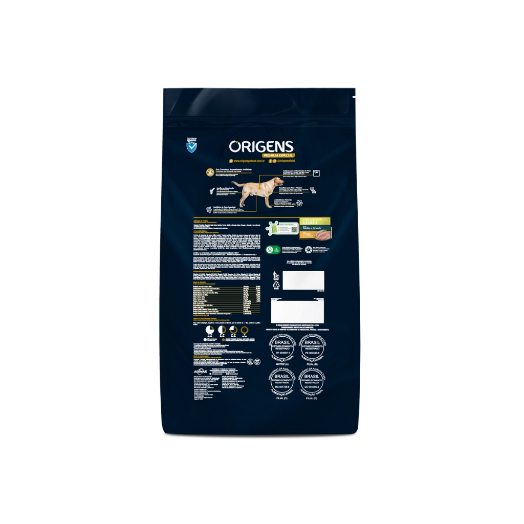 Racao Origens Caes Adultos Light Racas Medias e Grandes Frango e Cereais - 15kg - Indicado para cães; - Para cães adultos; - Auxilia na redução de peso; - Com omegas 3 e 6; - Com fibras e extrato de Yucca; - Vitamina C, Vitamina E e Selenio Quelato. Origens Premium Especial Light Cães Adultos Portes Médio e Grande Sabor Frango e Cereais possui ingredientes de alta qualidade e não contém corantes e aromatizantes artificiais. Origens Cães Adultos Light faz o equilíbrio da flora intestinal; a combinação de Prebióticos, Fibras e Extrato de Yucca auxilia na formação de fezes mais firmes e com menos odor. Colabora para a manutenção de peso. Contém Vitamina C, Vitamina E e Selenio Quelato, além de ajudar no suporte das articulações. Ingredientes Farinha de vísceras de aves, milho moído*, farelo de trigo, farinha de carne e osso de bovinos, óleo de aves, hidrolisado de fígado de aves e miúdos de suínos, farelo de glúten de milho-60*, cloreto de sódio, linhaça, maca desidratada, vegetais desidratados (cenoura, espinafre e polpa de beterraba), farinha de algas Schizochytrium sp., hexametafosfato de sódio (0,1%), inulina, parede celular de levedura, extrato de yucca (0,04%), colágeno hidrolisado (0,04%), sulfato de glicosamina (0,04%), sulfato de condroitina (0,004%), vitaminas (retinol, colecalciferol, acetato de DL-alfa-tocoferol, menadiona bissulfito de sódio, tiamina, riboflavina, piridoxina, cianocobalamina, niacina, pantotenato de cálcio, ácido fólico, biotina, cloreto de colina, ácido ascórbico), minerais (sulfato de ferro, sulfato de cobre, sulfato de manganês, sulfato de zinco, iodato de cálcio, selenito de sódio, proteinato de zinco, levedura enriquecida com selênio), taurina, L-carnitina (0,001%), ácido propiónico, BHA (Butilhidroxianisol) e BHT (Butilhidroxitolueno).