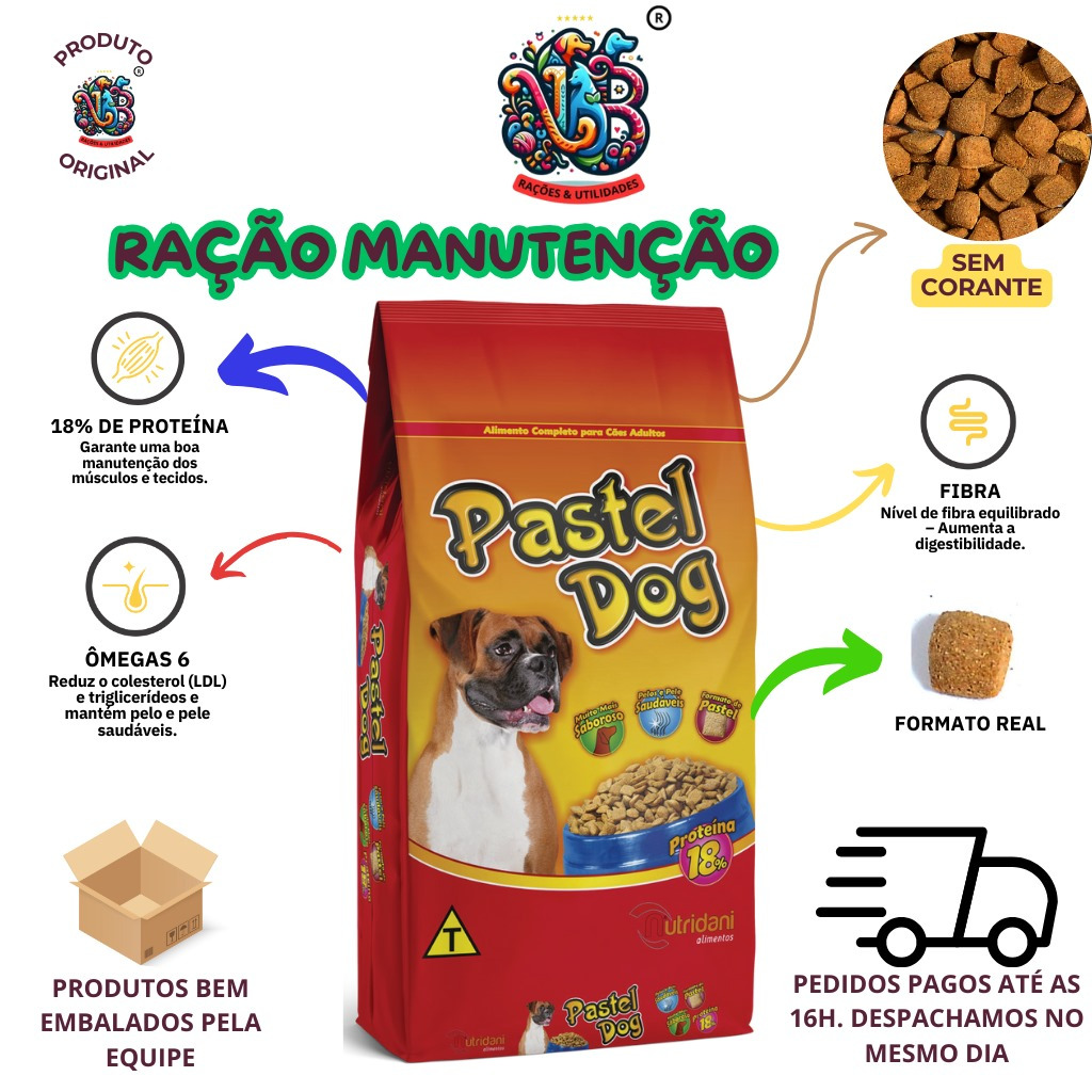 A Ração Pastel Dog para Cães Adultos Sabor Carne é um alimento completo e balanceado, desenvolvido para atender às necessidades nutricionais de cães adultos. Formulada com ingredientes selecionados, visa proporcionar uma dieta equilibrada e saborosa para o seu pet. Composição: Milho integral moído Farelo de trigo Farelo de soja Cloreto de sódio Farinha de carne e ossos Farinha de vísceras Farelo de arroz Premix vitamínico mineral Antifúngico Gordura animal estabilizada Antioxidante Palatabilizante de origem animal Níveis de Garantia: Proteína Bruta (mínimo): 18% Matéria Fibrosa (máximo): 6,50% Matéria Mineral (máximo): 12% Extrato Etéreo (mínimo): 7% Fósforo (mínimo): 0,90% Cálcio (máximo): 2,40% Umidade (máximo): 12%