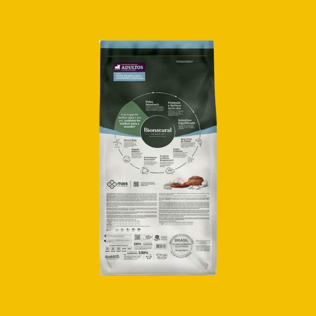 A Bionatural Prime Super Premium Natural Sensitive é um alimento completo de alta performance, especialmente desenvolvido para cães adultos de raças pequenas (a partir de 12 meses) que possuem maior sensibilidade digestiva ou cutânea. Esta fórmula utiliza ingredientes nobres para promover uma vida saudável e equilibrada. Funções e Benefícios para o seu Pet Fórmula Sensitive: Desenvolvida para minimizar reações alérgicas, focando na saúde da pele e pelagem. Proteção e Reforço Articular: Com Glicosamina para fortalecer as articulações e Condroitina para inibir a degradação da cartilagem. Redução do Tártaro: Textura e ingredientes que auxiliam no cuidado oral diário e na saúde dentária. Intestino Equilibrado: Contém prebióticos e probióticos que regulam o sistema digestivo e melhoram a qualidade das fezes. Nutrição Natural: Zero adição de transgênicos, zero corantes e aromatizantes artificiais, utilizando 100% de antioxidantes naturais. Sustentabilidade e Materiais Embalagem Reciclável: Produzida com monomaterial para facilitar 100% o processo de reciclagem. Aterro Zero: Fabricante certificada que opera com descarte mínimo de resíduos no meio ambiente. Eficiência Hídrica: Captação de água da chuva para reaproveitamento nos processos industriais. Livre de Gaiolas: Utilização de ovos provenientes de galinhas criadas livres de gaiolas (cage-free). Carne Fresca: Produzida com carnes frescas selecionadas para garantir máxima palatabilidade. Detalhes Técnicos Peso Líquido: 10,1kg. Sabor Principal: Peixe Branco e Salmão (conforme base da linha Sensitive). Indicação: Cães adultos de pequeno porte. Validade do Lote: 13/09/2027.