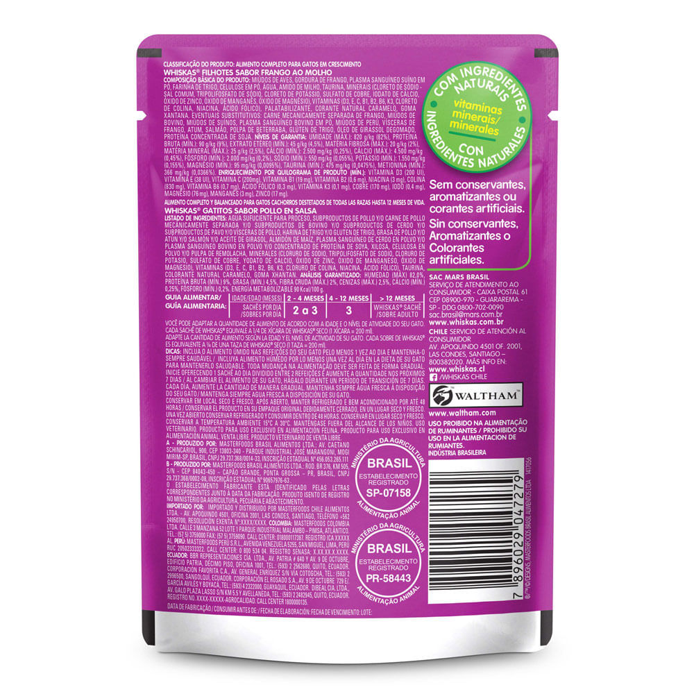 RAÇÃO PARA GATOS WHISKAS FILHOTES 2-12 MESES SACHÊ A marca Whiskas entende da natureza dos gatos desde as suas primeiras mordidas. Por isso criamos o Whiskas Filhotes, que proporciona todos os nutrien