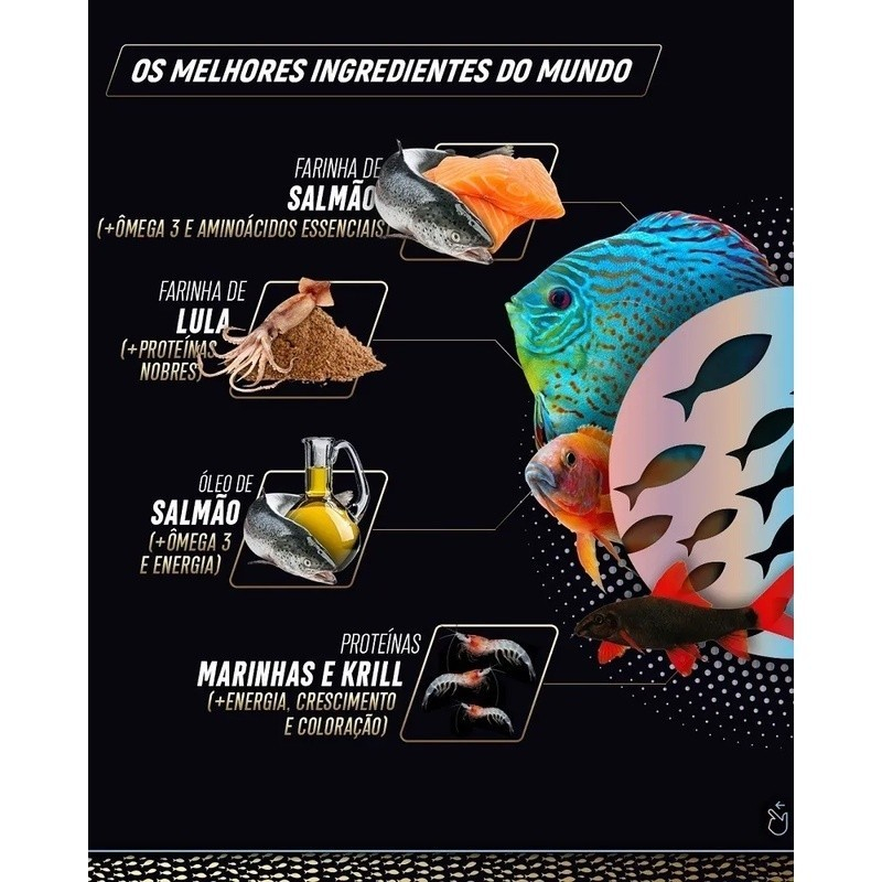 A Colors Black Line é um alimento completo super premium que fornece nutrição avançada, projetada com um alto teor de impulsionadores de cores naturais e ingredientes especiais que garantem o desenvolvimento de uma coloração intensa e viva. É indicada para todas as espécies de peixes de água doce e salgada. Com pellets em forma de crisps e com 1,5 mm atende uma ampla gama de espécies, onde os grânulos afundam lentamente tornando-se ideal para todos os peixes que se alimentam nas camadas intermediárias e no fundo, com aproveitamento integral de cada partícula. A Colors Black Line é um alimento com alta inclusão de proteínas nobres como farinha de salmão, farinha de lula, hidrolisado de proteína marinha e krill, sendo uma excelente fonte de aminoácidos essenciais, vitaminas e ácidos graxos poliinsaturados. A suplementação de astaxantina (270mg/kg) e ingredientes como o pimentão vermelho, Krill, farinha de alga Schizochytrium e microalga Haematococcus pluvialis (considerada a maior fonte natural de astaxantina do mundo), melhoram ainda mais a qualidade do produto com excelente realce nas cores naturais dos peixes, principalmente em espécies de cores quentes, além de efeito benéfico com alto poder antioxidante. Enriquecida com ômega-3 e fosfolipídios que atuam na melhor utilização da energia, transporte e absorção de nutrientes lipossolúveis como vitaminas e pigmentos naturais importantes na coloração dos peixes. Contém Alicina (óleo concentrado do Alho) e beta-glucanos responsáveis por promover a estimulação do sistema imunológico dos peixes, auxiliando na proteção contra diversas bactérias, vírus, fungos e parasitas. Um diferencial expressivo da Colors Black Line é que em sua formulação não tem a presença de transgênicos e corantes artificiais, proporcionando uma alimentação mais saudável a seus peixes.