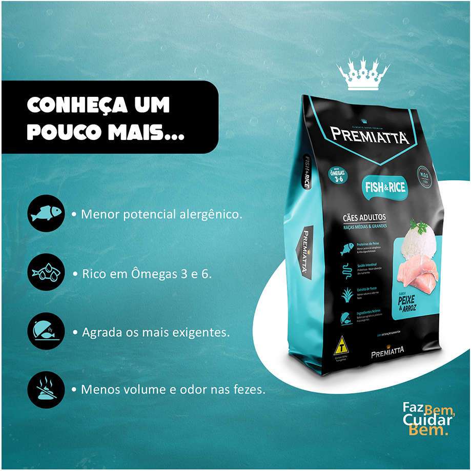 Ração Premiatta Cães Adultos Fish e Rice - 15kg - Indicado para cães; - Cães de porte médio e grande; - Possui farinha de peixe e arroz; - Contém Ômega 3 e 6; - Diminui o volume e odor das fezes; - Tem menor potencial alergênico; - Sabor peixe e artroz. A Ração Premiatta Fish & Rice é ideal para proporcionar uma dieta saudável e rica em nutrientes para seu pet. Indicada para cães adultos de porte médio e grande, a ração possui farinha de peixe e arroz em sua composição. Premiatta Cães Adultos Fish e Rice é um alimento completo que atende todas as necessidades nutricionais de cães adultos de todas as raças. Apresenta em sua formulação farinha de peixe e arroz, sendo ótimas fontes de proteína e energia. A proteína do peixe apresenta alto valor biológico, elevada digestibilidade e menor potencial alergênico do que outras fontes convencionais. Conta com a inclusão de Mannan-oligossacarídeos e Polpa de beterraba, avorecendo a microflora benéfica intestinal e um maior aproveitamento dos nutrientes, que juntamente com a Yucca Schidigera conferem um menor volume e odor fecal. Além disso, a proteína do peixe apresenta menor potencial alergênico do que outras fontes convencionais.