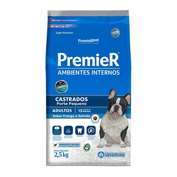 Ração Premier Ambientes Internos para Cães Adultos Castrados de Pequeno Porte Sabor Frango e Salmão - 2,5Kg