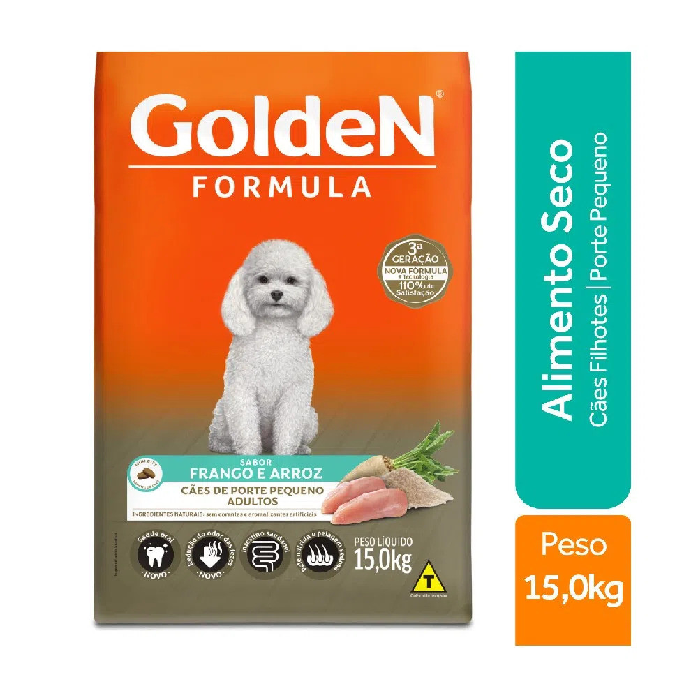 Ração Golden Fórmula Cães Adultos Mini Bits Frango E Arroz - Indicado para cães; - Para cães de porte pequeno; - Intestino equilibrado; - Pele saudável e pelagem bonita. Golden Formula Adultos Frango & Arroz Mini Bits é um alimento Premium Especial desenvolvido para cães adultos de pequeno porte. Os cães são essencialmente carnívoros e digerem muito melhor alimentos de origem animal. Apresenta grãos adequados para animais de pequeno porte, facilitando a mastigação. Golden Formula Adultos Frango & Arroz Mini Bits é um produto completo e visa, acima de tudo, proporcionar aos cães o nível ideal de todos os nutrientes que eles necessitam para uma vida longa e saudável. A Ração Golden Fórmula Cães Adultos Mini Bits Frango e Arroz auxilia na redução da formação do tártaro, reduz o odor das fez já que possui ingredientes especiais, tem alta digestibilidade. O Equilíbrio de ômegas e minerais melhora a pelagem e a pele. Indicações A ração golden adultos mini bits é indicado para cães adultos de pequeno porte em manutenção. Por se tratar de um alimento completo, balanceado e rico em nutrientes, não recomendamos nenhum tipo de suplementação vitamínico-mineral. Ingredientes Farinha de vísceras de frango, proteína isolada de suíno, milho integral moído*, quirera de arroz, polpa de beterraba, farelo de arroz desengordurado, gordura de frango, gordura suína, semente de linhaça, hidrolisado de suíno e frango, ácido propiônico, antioxidantes BHA e BHT, cloreto de potássio, cloreto de sódio, extrato de yucca (0,04%), hexametafosfato de sódio (0,1%), levedura seca de cana-de-açúcar, levedura seca de cervejaria, bentonita, vitamina A, vitamina B12, vitamina C, vitamina D3, vitamina E, vitamina K3, ácido fólico, ácido pantotênico, biotina, cloreto de colina, niacina, piridoxina, riboflavina, tiamina, iodeto de potássio, selênio metionina, sulfato de cobre, sulfato de ferro, sulfato de manganês, sulfato de zinco.