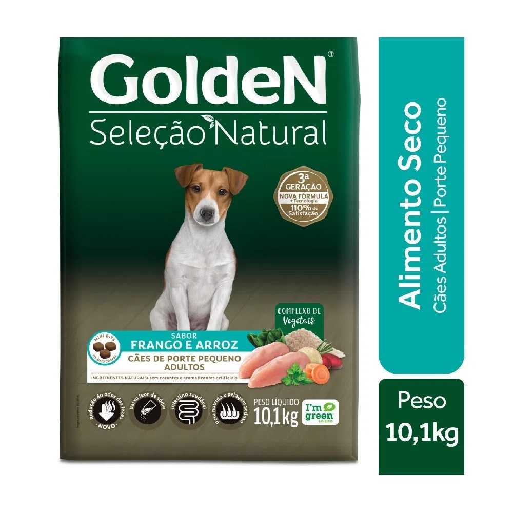 Ração Golden Seleção Natural Cães Adultos Mini Bits Frango E Arroz - Indicado para cães; - Cães adultos de pequeno porte; - Pelo e pele saudável; - Baixo teor de sódio. Ração Golden Seleção Natural Cães Adultos Mini Bits Frango e Arroz é um alimento Premium Especial que mantém a reconhecida qualidade da Família Golden. Uma linha completa de produtos criada a partir da rigorosa seleção e controle de matéria-prima e formulada com ingredientes exclusivos. Contém complexo de 6 vegetais, como fonte de fibras e sais minerais, baixo teor de sódio para ressaltar o sabor natural dos ingredientes, sem corantes e aromatizantes artificiais e sem ingredientes transgênicos. A linha Golden Seleção Natural é a melhor escolha para que seu pet tenha uma alimentação de acordo com seu estilo de vida. Golden Seleção Natural, saudável como seu estilo de vida. Possui equilíbrio entre ômega 3 e 6, mantendo sempre a pelagem do animal brilhosa e saudável. Indicação Este produto é indicado para cães adultos de pequeno porte em manutenção. Por se tratar de um alimento completo, balanceado e rico em nutrientes, não recomendamos nenhum tipo de suplementação vitamínico mineral. Ingredientes Farinha de vísceras de frango, proteína isolada de suíno, quirera de arroz, gordura de frango, gordura suína, óleo de peixe, complexo 6 vegetais ? 6,0% (polpa de beterraba branca e vegetais desidratados: cenoura, beterraba, salsa, alface e espinafre), antioxidantes BHA e BHT (0,012%), cloreto de potássio, hidrolisado de suíno e frango, levedura seca de cervejaria, parede celular de levedura, vitamina A, vitamina B12, vitamina C, vitamina D3, vitamina E, vitamina K3, ácido fólico, ácido pantotênico, biotina, cloreto de colina, niacina, piridoxina, riboflavina, tiamina, iodeto de potássio, proteinato de selênio, sulfato de cobre, sulfato de ferro, sulfato de manganês, sulfato de zinco, zinco aminoácido quelato.