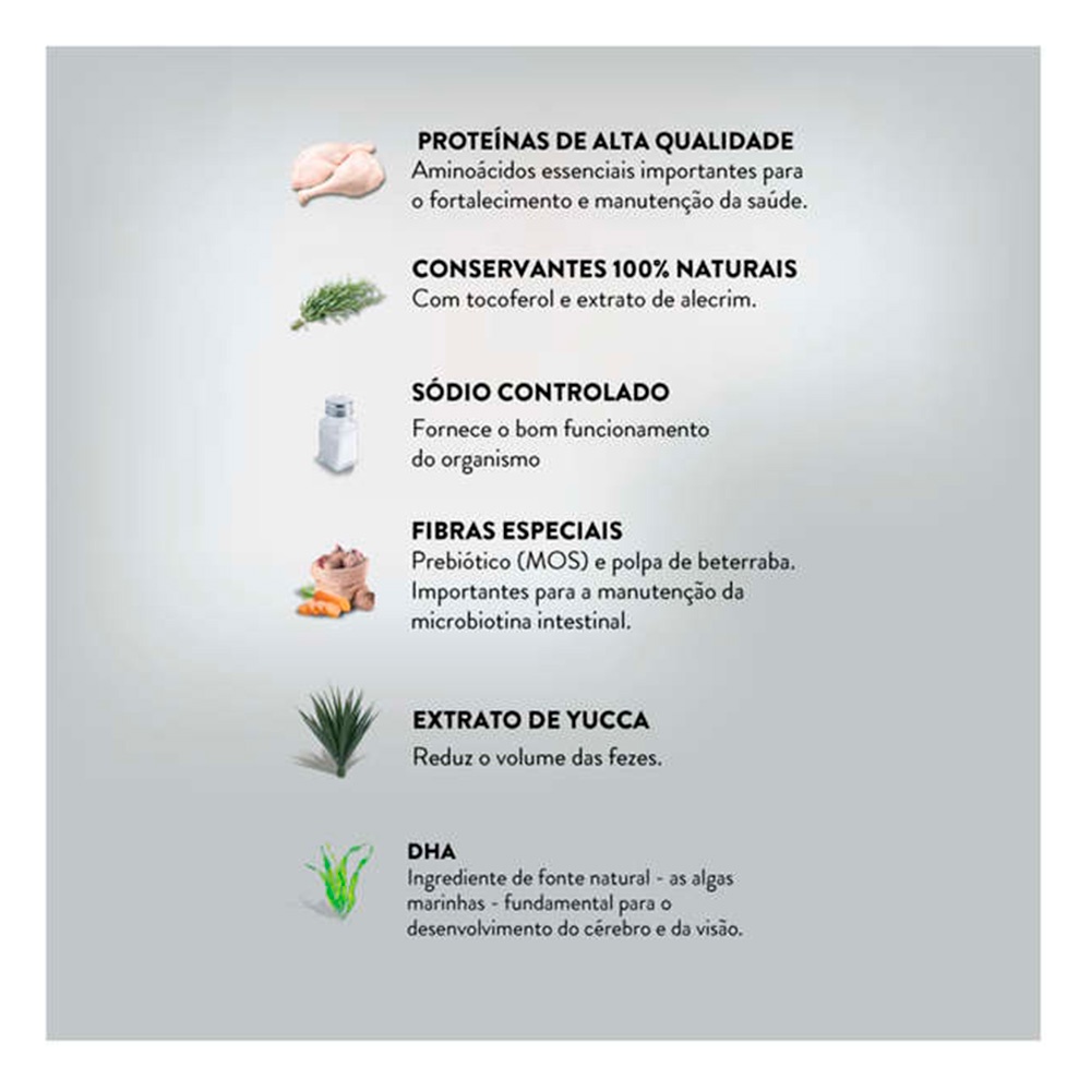 Ração Quatree Life Cães Filhotes Raças Médias e Grandes Frango e Arroz - 15kg - Indicado para cães filhotes; - Para cães de porte médio e grande; - Contém Ômega 3 e 6; - Auxilia no intestino saudável; - Livre de transgênicos. Ração Quatree Life Cães Filhotes Raças Médias e Grandes foi desenvolvido com o objetivo de proporcionar uma alimentação mais saudável para o seu cão. É um alimento Premium Especial livre de transgênicos e formulado com conservantes 100% naturais para promover uma nutrição equilibrada. A combinação de prebiótico (MOS) e fibras especiais otimiza a absorção dos nutrientes, melhorando a consistência e atenuando o odor das fezes. Possui DHA, ácido graxo importante para o desenvolvimento do sistema nervoso, do processo de aprendizagem e da visão dos filhotes. É rico em proteínas de alto valor biológico, cereais nobres, vegetais, vitaminas e minerais, uma receita saborosa que proporciona tudo que o seu cão necessita para crescer forte e saudável. Modo de usar Fornecer diariamente o alimento Quatree Life Filhotes Raças Médias e Grandes dividido em duas a quatro porções, de acordo com o peso do animal. As quantidades indicadas na tabela são uma referência, podendo variar conforme a raça, idade e atividade do cão ou de acordo com a orientação do médico veterinário. Peso estimado do Cão Quantidade diária Porte Desmame até 3 meses 4 a 6 meses 7 a 12 meses 13 a 18 meses 15kg 226g 282g 271g - 20kg 257g 335g 346g - 25kg 284g 383g 412g - 30kg 348g 447g 465g 457g 35kg 459g 530g 515g 505g 40kg 503g 590g 572g 563g 45kg 539g 642g 614g 610g Acima de 50kg 565g 695g 673g 664g Um copo de 250ml equivale a aproximadamente 114g de Quatree Life Filhotes Raças Médias e Grandes. Composição Farinha de vísceras de frango (mín. 28%), arroz quebrado (mín. 35%), proteína isolada de suíno (farinha de torresmo), farinha de peixe, sorgo integral moído, gordura de frango, gordura suína, polpa de beterraba (mín. 2,0%), farelo de trigo, semente de linhaça, cenoura desidratada, levedura seca de cerveja, farinha de algas (DHA), cloreto de potássio, glucanos, hidrolisado de fígado de frango e suíno, mananoligossacarídeo (MOS), extrato de yucca (mín. 0,025%), extrato de alecrim (mín. 0,001%), tocoferol (mín. 0,09%), ácido propiônico, vitaminas (A, D3, E, B1, B2, B6, B12, K, C, ácido pantotênico, ácido fólico, niacina, biotina, cloreto de colina), minerais (sulfato de zinco, sulfato de cobre, sulfato ferroso, sulfato de manganês, iodato de cálcio, selenito de sódio), minerais quelatados (manganês, selênio e zinco).