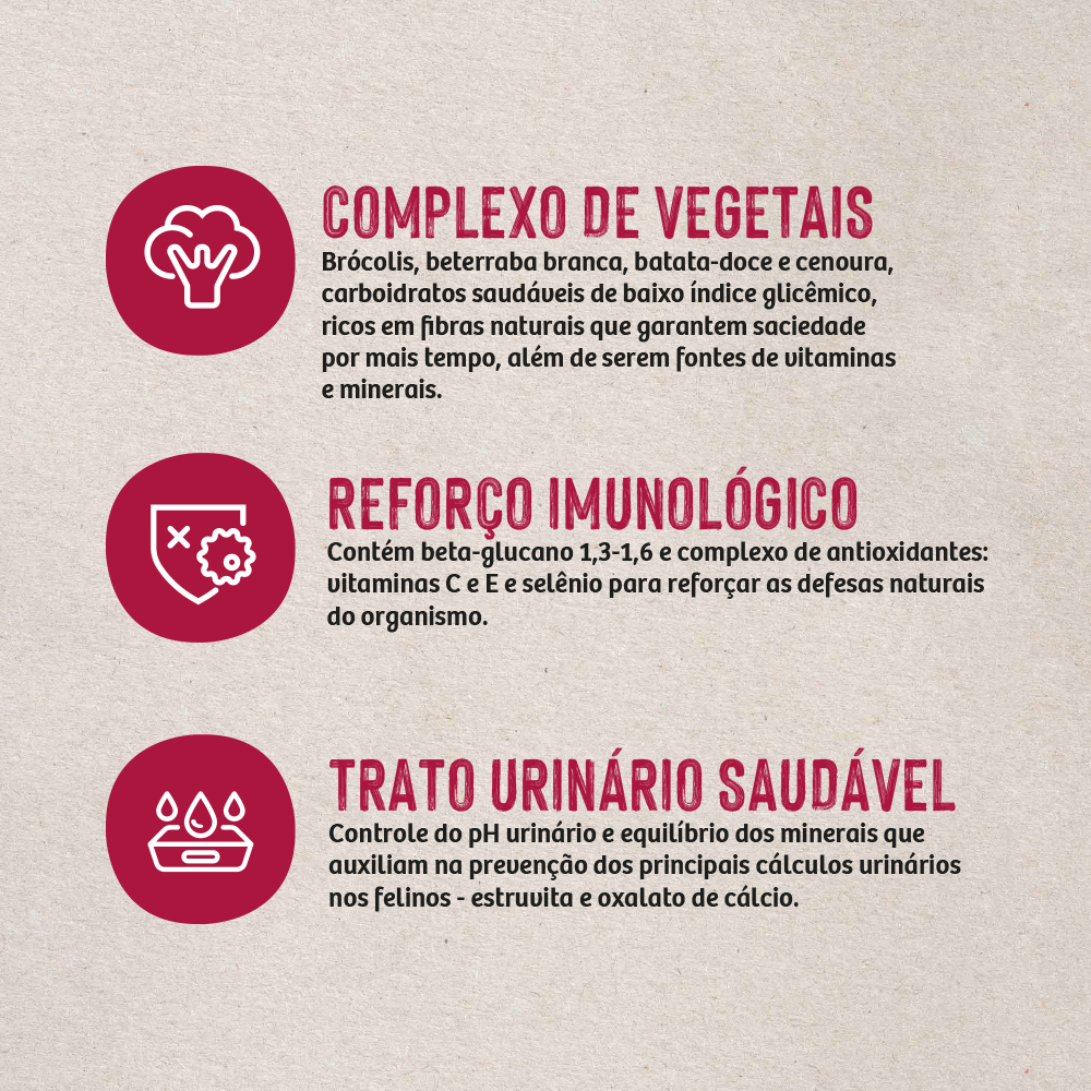 Composição Básica: Farinha de vísceras de frango (mín. 28%), farinha de salmão (mín. 1%), farinha de torresmo, arroz quebrado (mín. 20%), grão de sorgo (mín. 0,5%), óleo de aves, gordura suína, complexo de vegetais (mín. 2,5%) (farinha de batata-doce, polpa desidratada de beterraba, brócolis desidratado, cenoura desidratada), grão de linhaça (mín. 0,5%), levedura de cervejaria inativada desidratada, celulose (mín. 0,05%), lignocelulose (mín. 0,05%), mananoligossacarídeo (MOS) (mín. 0,1%), extrato de yucca (mín. 0,025%), zeólita (mín. 0,1%), bentonita, taurina, DL-metionina, lisina, parede celular de levedura (fonte de beta-glucanas 1,3-1,6), levedura enriquecia com selênio, extrato de alecrim (mín. 0,001%), tocoferol (concentrado) (mín. 0,09%), hidrolisado de fígado de aves e suíno, cloreto de potássio, ácido cítrico, ácido fosfórico, vitamina A, vitamina D3, vitamina E, vitamina K3, vitamina C, vitamina B1, vitamina B2, vitamina B6, vitamina B12, niacina (ácido nicotínico), cloreto de colina, ácido fólico, biotina, D-pantotenato de cálcio, sulfato de cobre monohidratado, sulfato de ferro, sulfato de manganês, sulfato de zinco, iodato de cálcio, selenito de sódio, proteinato de manganês, proteinato de zinco.