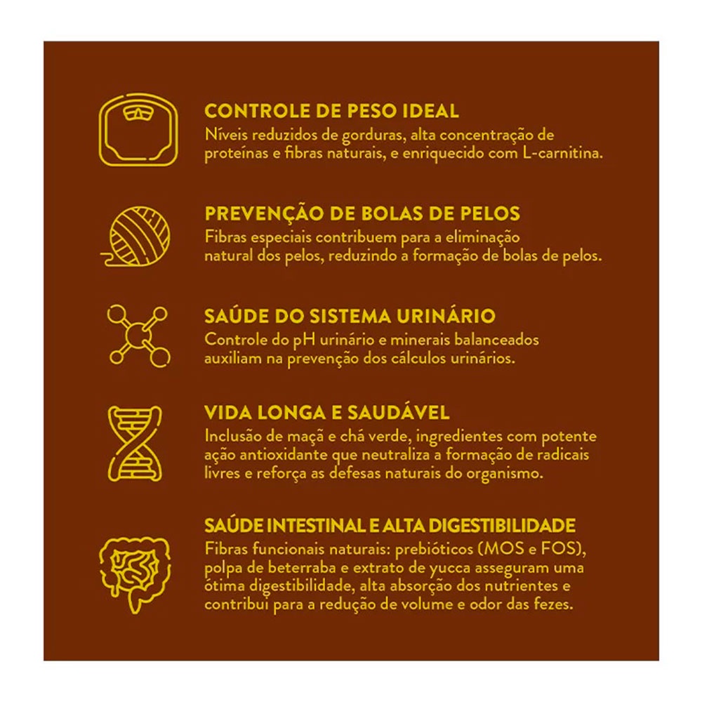 Ração Quatree Supreme Gatos Castrados Frango e Batata doce - 15kg - Indicado para gatos; - Para gatos castrados; - Saúde da pele e pelagem; - Saúde do sistema urinário; - Alta digestibilidade; - Prevenção da bola de pelos. Ração Quatree Supreme Gatos Castrados Frango é um alimento Super Premium formulado com conservantes 100% naturais e livre de transgênicos, garantindo fácil digestão e absorção dos nutrientes. A combinação de proteínas selecionadas e ingredientes naturais e funcionais garante mais saúde e vitalidade para o seu gato. Quatree Supreme Gatos Castrados possui níveis de gorduras reduzidos e com isso faz o controle de peso ideal. Além disso, contém fibras especiais que contribuem para a eliminação de bolas de pelos. Sem contar que é ótimo para a saúde do sistema urinário, contém controle de pH e minerais balanceados. A ração tem alta digestibilidade com suas fibras naturais: prebióticos (MOS e FOS), polpa de beterraba e extrato de yucca. Modo de usar Fornecer diariamente o alimento Quatree Supreme Gatos Castrados Frango de acordo com o peso do animal. As quantidades indicadas na tabela são uma referência, podendo variar conforme a raça, idade e atividade do gato ou de acordo com a orientação do médico veterinário. QUANTIDADE DIÁRIA FILHOTES - 6 A 12 MESES Idade Porção 6 a 9 meses 75g 9 a 12 meses 70g Adultos Peso do gato adulto Porção 2Kg 30g 3Kg 40g 4Kg 45g 5Kg 55g 6Kg 60g 7Kg 65g 8Kg 75g Energia Metabolizável 3.820 kcal/kg Um copo de 250ml equivale a aproximadamente 120g de Quatree Supreme Gatos Castrado. Composição Farinha de vísceras de frango, proteína isolada de suíno, farinha de peixe, ovo integral desidratado, gordura suína, gordura de frango, arroz quebrado, sorgo integral moído, farinha de batata doce, glúten de trigo, semente de linhaça, polpa de beterraba (mín. 1,0%), levedura de cerveja, celulose, lignocelulose, inulina (FOS) (mín. 0,15%), mananoligossacarídeo (MOS) (mín. 0,1%), cloreto de sódio, cloreto de potássio, hidrolisado de fígado de frango e suíno, hexametafosfato de sódio (mín. 0,1%), ácido fosfórico, glucanos, zeólita, extrato de yucca, taurina, metionina, lisina, L-carnitina (mín. 0,03%), tocoferol, extrato de alecrim, extrato de maçã, extrato de chá verde, vitaminas (A, D3, E, B1, B2, B6, B12, K3, C, ácido pantotênico, ácido fólico, niacina, biotina, cloreto de colina), minerais (sulfato de zinco, sulfato de cobre, sulfato ferroso, sulfato de manganês, iodato de cálcio, selenito de sódio) e minerais quelatados (manganês, selênio e zinco).