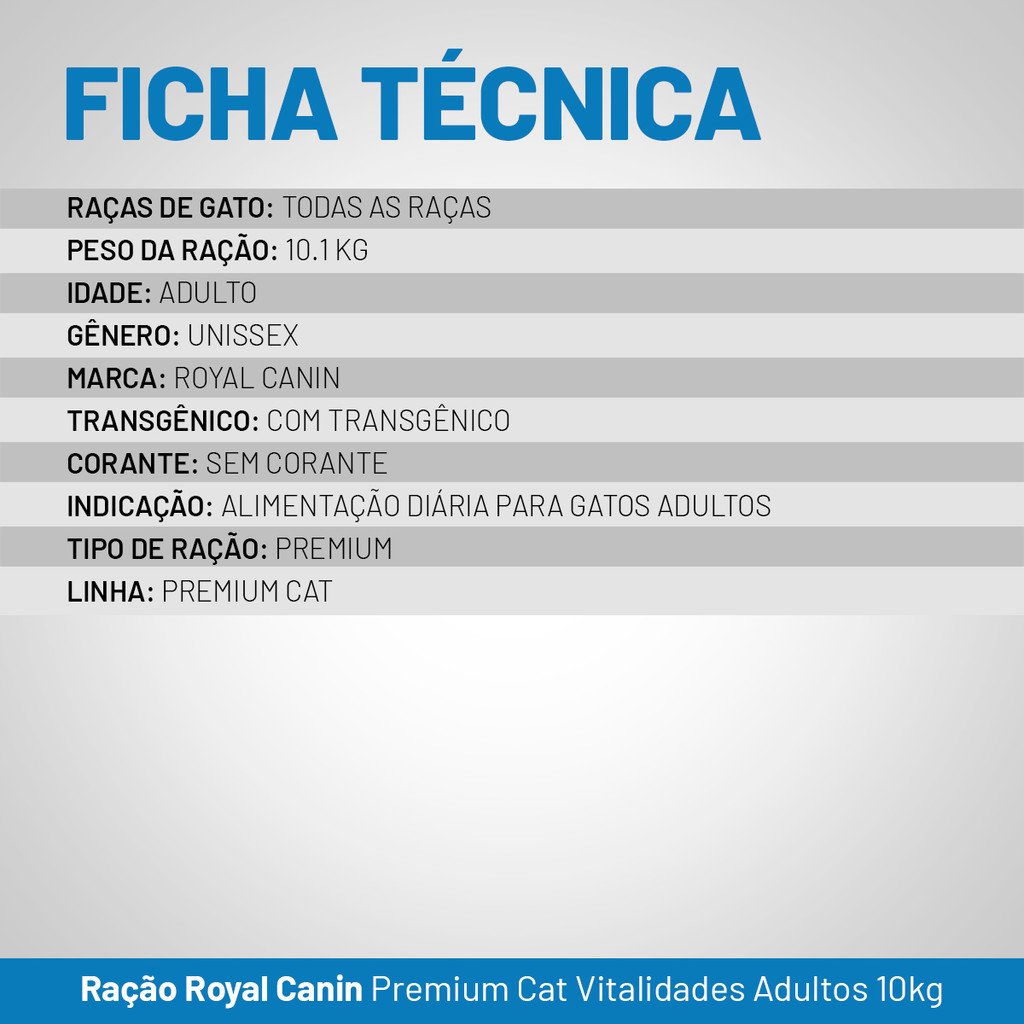 Ração Royal Canin - Premium Cat - Vitalidade - Gatos - (Adultos) 10Kg ____________________________________________________________________________ CARACTERÍSTICAS PRINCIPAIS Marca Royal Canin Fabricante Mars Petcare Linha Premium Cat Nome Premium Gatos Vitalidade Animal de estimação recomendado Gatos Etapa de vida do animal Adultos Tamanho da raça Todas as Raças Sabor Mix Peso do Alimento 10,1kg Tipo de comida para animais Seca ____________________________________________________________________________ A nossa loja está a mais de 10 anos no mercado, com produtos originais e com nota fiscal. ____________________________________________________________________________ RAÇÃO ROYAL CANIN - PREMIUM CAT - BELEZA DA PELAGEM - GATOS - (ADULTOS) 10KG Elaborada para garantir um excelente aproveitamento dos nutrientes, a Ração Royal Canin Premium Cat Vitalidade Gatos Adultos tem tudo o que seu gatinho precisa para se alimentar com saúde e muita qualidade. A Ração Royal Canin Vitalidade supre as necessidades diárias de ingestão de nutrientes, enquanto oferece um sabor inigualável ao seu gato: até mesmo os paladares mais exigentes vão se surpreender! A boa saúde do trato urinário também é preservada com a ingestão da Ração Royal Canin Premium Cat Vitalidade, que vai além e melhora a qualidade e consistência das fezes do seu gato, facilitando a sua vida no momento da limpeza. INFORMAÇÕES DO PRODUTO: - Satisfaz os apetites mais exigentes; - Alimento indicado para gatos adultos; - Proporciona nutrição essencial diária; - Contribui para a saúde do trato urinário; - Contém ingredientes que proporcionam uma ótima digestão. BENEFÍCIOS: NUTRIÇÃO COMPLETA E ALTA PALATABILIDADE: Esta ração fornece todos os nutrientes essenciais para gatos adultos, promovendo energia, vitalidade e manutenção do peso corporal ideal. Além disso, sua formulação agrada até os paladares mais exigentes, garantindo uma experiência alimentar satisfatória para seu gato. SAÚDE DO TRATO URINÁRIO: A composição balanceada da ração contribui para a saúde do trato urinário dos felinos, prevenindo problemas comuns nessa área e promovendo um estilo de vida mais saudável. DIGESTIBILIDADE SUPERIOR E QUALIDADE DAS FEZES: Com ingredientes que favorecem uma digestão eficiente, esta ração melhora a qualidade e consistência das fezes do seu gato, facilitando a limpeza da caixa de areia e reduzindo odores desagradáveis. A Ração Royal Canin Premium Gatos Adultos Vitalidade é ideal para manter seu gato saudável, satisfeito e feliz. ____________________________________________________________________________ Gostou? Não perca tempo, garanta já o seu!