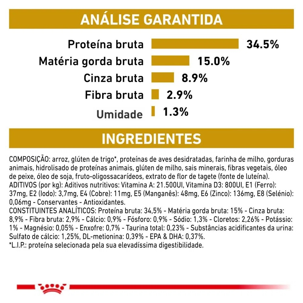 - Indicada para gatos adultos; - Suporte nutricional que auxilia a dissolver cálculos de estruvita; - A diluição urinária promove um meio urinário desfavorável à formação de cálculos de estruvite e de oxalato de cálcio; - O sistema RSS permite diminuir a concentração urinária de íons que contribuem para a formação dos cristais; A Ração Royal Canin Feline Veterinary Diet Urinary S/O é uma ração coadjuvante indicada para gatos adultos com doenças do trato urinário. É especificamente formulada para ajudar a apoiar gatos com sensibilidades urinárias tais como cristais e cálculos de estruvite. Esta fórmula ajuda a dissolver todos os tipos de cálculos de estruvite que se podem formar na bexiga. Ajuda a diluir a urina, tornando menos provável a formação de cálculos de estruvite ou oxalato de cálcio. Contém uma baixa RSS (sobressaturação relativa) para ajudar a reduzir a concentração de íons que podem contribuir para a formação de cristais no trato urinário. Teor reduzido de magnésio, um componente natural dos cristais de estruvite. Também promove um ambiente urinário desfavorável ao desenvolvimento tanto de cálculos por estruvite como de oxalato de cálcio. É importante que este produto seja dado ao seu animal de estimação apenas quando recomendado por um médico veterinário. Composição Quirera de arroz, milho integral moído*, farinha de torresmo, farinha de vísceras de aves, farelo de glúten de milho*, gordura de frango, fibra de soja*, glúten de trigo, gordura suína, óleo de peixe refinado, óleo de soja refinado*, cloreto de sódio (sal comum), cloreto de potássio, fosfato monocálcico, bissulfato de sódio, fruto-oligossacarídeos, extrato de marigold, vitaminas (A, D3, E, B1, B2, B6, B12, PP), ácido pantotênico, biotina, ácido fólico, cloreto de colina, sulfato de ferro, sulfato de cobre, sulfato de cálcio, óxido de zinco, óxido de manganês, iodato de cálcio, levedura enriquecida com selênio, zinco aminoácido quelato, manganês aminoácido quelato, cobre aminoácido quelato, DL-metionina, taurina, palatabilizante à base de fígado de frango, antioxidante (BHA).