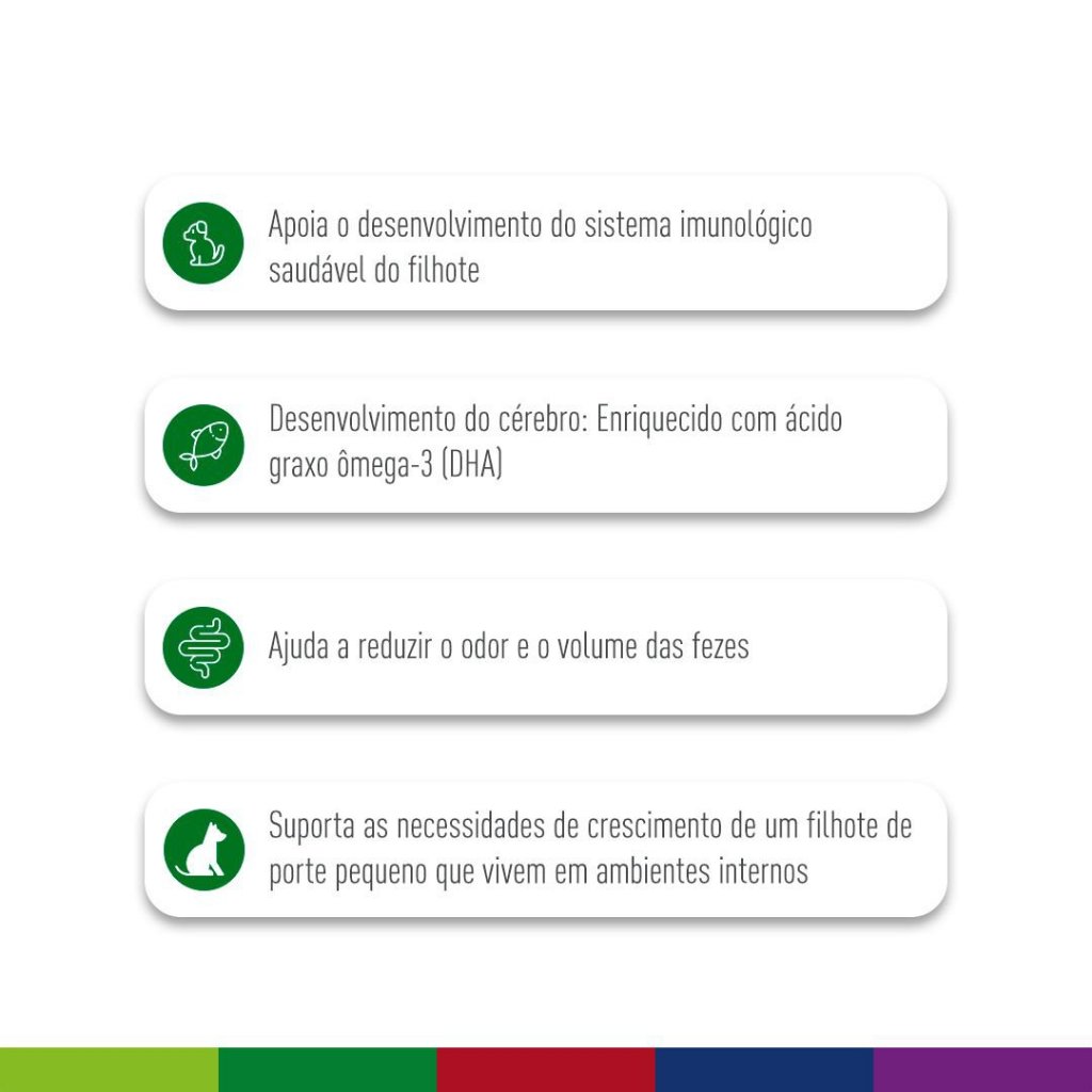 ROYAL CANIN® Mini Indoor Puppy é uma ração super premium completa, indicada para filhotes de pequeno porte (peso até 10 kg quando adultos), entre 2 e 10 meses de idade e que vivem em ambientes internos. O primeiro ano do filhote é um período-chave, cheio de mudanças e descobertas, no qual o seu cão estabelece as bases para o seu futuro. Por isso, este alimento possui uma fórmula exclusiva para apoiar um crescimento saudável, com um fornecimento ideal de energia, proteínas, cálcio e fósforo. Fortalecimento do Sistema Imunológico: apoia o desenvolvimento do sistema imunológico saudável do filhote com a inclusão de um complexo cientificamente comprovado, incluindo vitaminas E e C. Desenvolvimento do Cérebro: Enriquecido com ácido graxo ômega-3 (DHA) que é cientificamente comprovado por apoiar o desenvolvimento cerebral do filhote e promover seu aprendizado desde o início dos treinamentos. Apoio à vida em ambientes internos: Ajuda a reduzir o odor e o volume das fezes com uma combinação de prebióticos, proteínas altamente digestíveis e uma mistura específica de fibras. Conteúdo energético ideal: Suporta as necessidades de crescimento de um filhote de porte pequeno que vivem em ambientes internos, considerando seu estilo de vida com um conteúdo de energia controlado. Composição ideal para o momento de transição para alimentos para adultos. Sem adição de aromas e corantes artificiais.