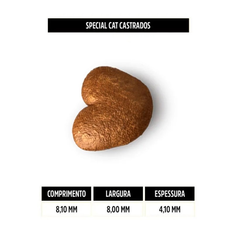 Ração Special Cat Adultos Castrados - 20Kg - Indicado para gatos; - Redução do odor nas fezes; - Controla o peso ideal; - Proteínas de alta qualidade; - Auxilia na manutenção do trato urinário; - Contém Taurina, essencial ao coração e visão. A Ração Special Cat Premium para Gatos Adultos Castrados vem com ingredientes nobres e minerais orgânicos que são facilmente absorvidos pelo organismo. Possuí uma alta digestibilidade e palatabilidade, contém pré-bióticos mos e fos que auxiliam na absorção de nutrientes, e claro que não poderia faltar o extrato de yucca que reduz o odor das fezes. Composição Farinha de vísceras de frango, plasma suíno em pó, arroz quebrado, milho integral moído, farelo de glúten de milho 60, soja micronizada, gordura de frango, óleo de peixe, farelo de arroz, farelo de arroz desengordurado, celulose, levedura seca de cana-de-açúcar, extrato de Yucca schidigera (0,05%), mananoligossacarídeos (0,048%), hidrolisado de fígado de frango e suíno, cloreto de sódio (sal comum), cloreto de potássio, L-lisina, taurina, L-carnitina, vitamina A, vitamina D3, vitamina E, vitamina K3, vitamina B1, vitamina B2, vitamina B6, vitamina B12, vitamina C, niacina, cloreto de colina, ácido pantotênico, ácido fólico, biotina, iodato de cálcio, sulfato de cobre, sulfato de ferro, levedura enriquecida com selênio, proteinato de manganês, proteinato de zinco, propionato de amônia, sorbato de potássio, parede celular de levedura, acidificante, antioxidantes (BHA e BHT), corante natural caramelo.