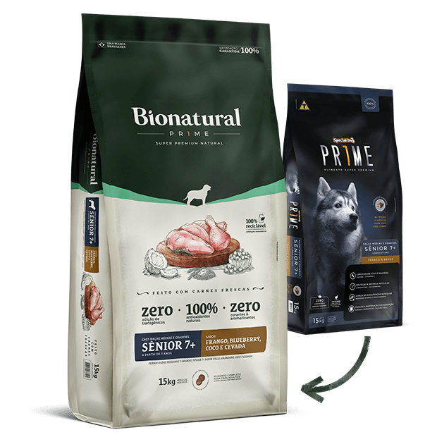 Racao Special Dog Bionatural Prime Raças Medias E Grandes Senior 7+ A Ração Bionatural Prime Para Cães Sênior Porte Médio e Grande 15Kg é formulada para atender às necessidades específicas de cães sêniores de porte médio e grande. Com ingredientes de alta qualidade e nutrientes balanceados, promove a saúde geral, apoio às articulações e mantém a vitalidade do seu pet. Composição básica: Carne fresca (mín. 3% - carne mecanicamente separada de frango e fígado de suínos), farinha de vísceras de aves, ovo em pó, plasma sanguíneo desidratado de suíno, arroz quebrado, sorgo integral moído, farinha de ervilha, ômega 3 [óleo de peixes e biomassa de microalgas (Schizochytrium sp.)], óleo de aves, grão de cevada (mín. 3,95%), blueberry (mirtilo mín. 0,015%), coco em flocos (mín. 0,015%), maçã, fibra de cana-de-açúcar, levedura de cervejaria inativada desidratada, extrato de Yucca schidigera, aditivo prebiótico (mananoligossacarídeos 0,006%), aditivos probióticos (Bifidobacterium lactis e Lacticaseibacillus rhamnosus), hidrolisado de carne de aves e fígado de aves, hexametafosfato de sódio, sulfato de condroitina (0,03%), sulfato de glicosamina (0,05%), regulador de acidez, concentrado de tocoferol, extrato de alecrim, extrato de chá verde (Camellia sinensis), extrato de menta, hortelã (Mentha spp.), DL-metionina, L-lisina, taurina, cloreto de sódio, cloreto de potássio, vitamina A, vitamina D3, vitamina E, vitamina K3, vitamina B1, vitamina B2, vitamina B6, vitamina B12, vitamina C, niacina, cloreto de colina, ácido pantotênico, ácido fólico, biotina, iodato de cálcio, proteinato de cobre, proteinato de ferro, proteinato de manganês, proteinato de zinco, levedura enriquecida com selênio, ácido propiônico, parede celular de levedura.